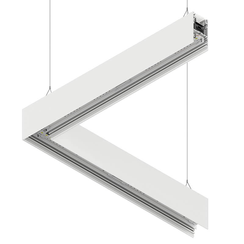 PROFILO LED ANGOLARE 90? ad emissione di luce diretta-indiretta, installabile a sospensione in fila continua. Profilo in lega di alluminio verniciato alimentatori elettronici per doppia accensione, diffusore per luce indiretta e cavi di sospensione regolabili L.1200 mm inclusi. Schermo, testate terminali, kit di giunzione e kit di alimentazione da ordinare a parte.