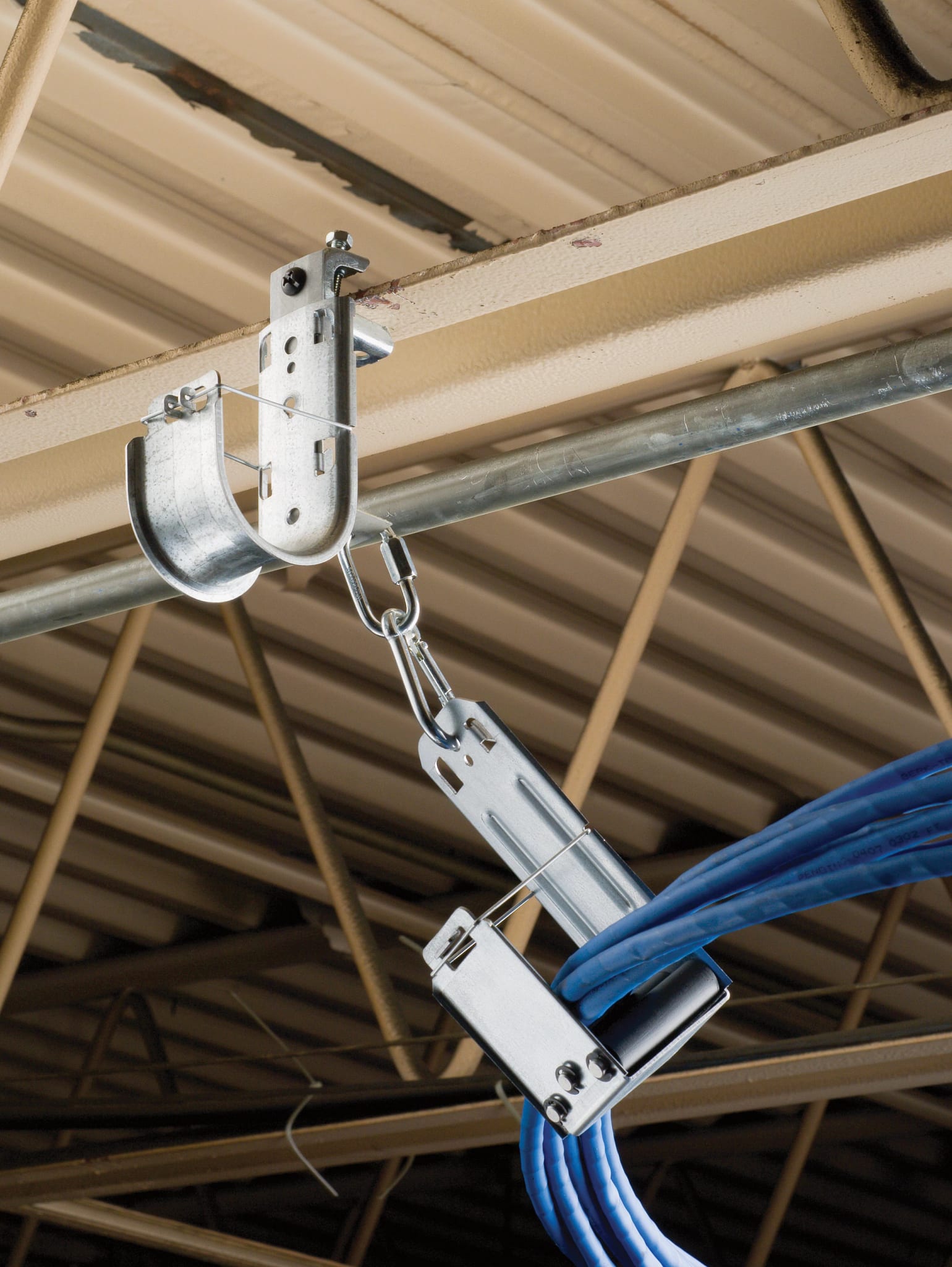 Riduce al minimo la tensione di trazione ai sensi della norma TIA 568-C.5.3.1 durante l'installazione dei cavi per la trasmissione di dati ad alte prestazioni. Include il dispositivo di fissaggio, la vite, la staffa angolare, la staffa di montaggio ad albero, il moschettone e il morsetto.