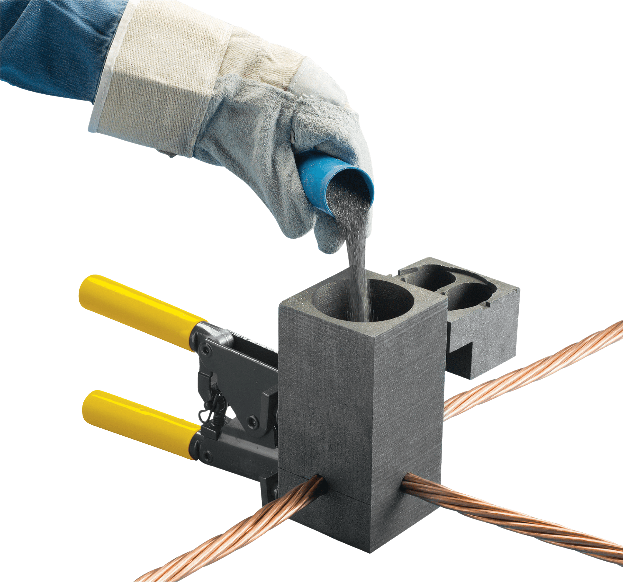 Stampo in grafite Cadweld progettato per creare conn. saldate esotermicamente cavo-acc. Il kit include lo stampo Cadweld VGPY1M per 25mm2 orizzontale attraverso il cavo in acc. vert., il mors. per maniglia L161 e il set di utensili Cadweld.