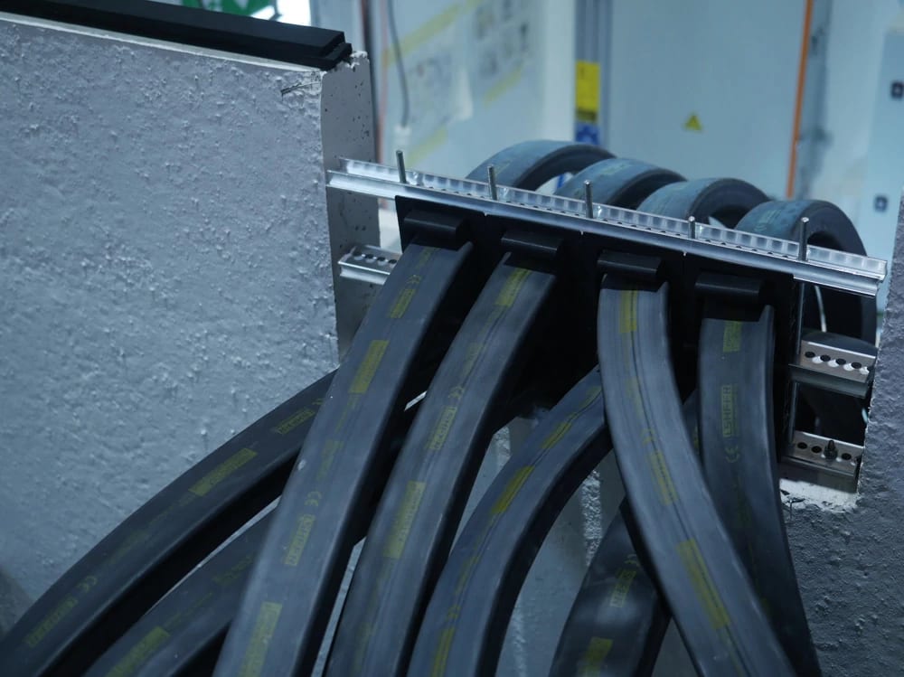 Il conduttore nVent ERIFLEX FleXbus è pronto all'uso da un lato per il collegamento diretto alla sbarra o al terminale dell'interruttore. 220 mm², 5.000 mm x 25 mm x 12,5 mm x 6,3 kg.