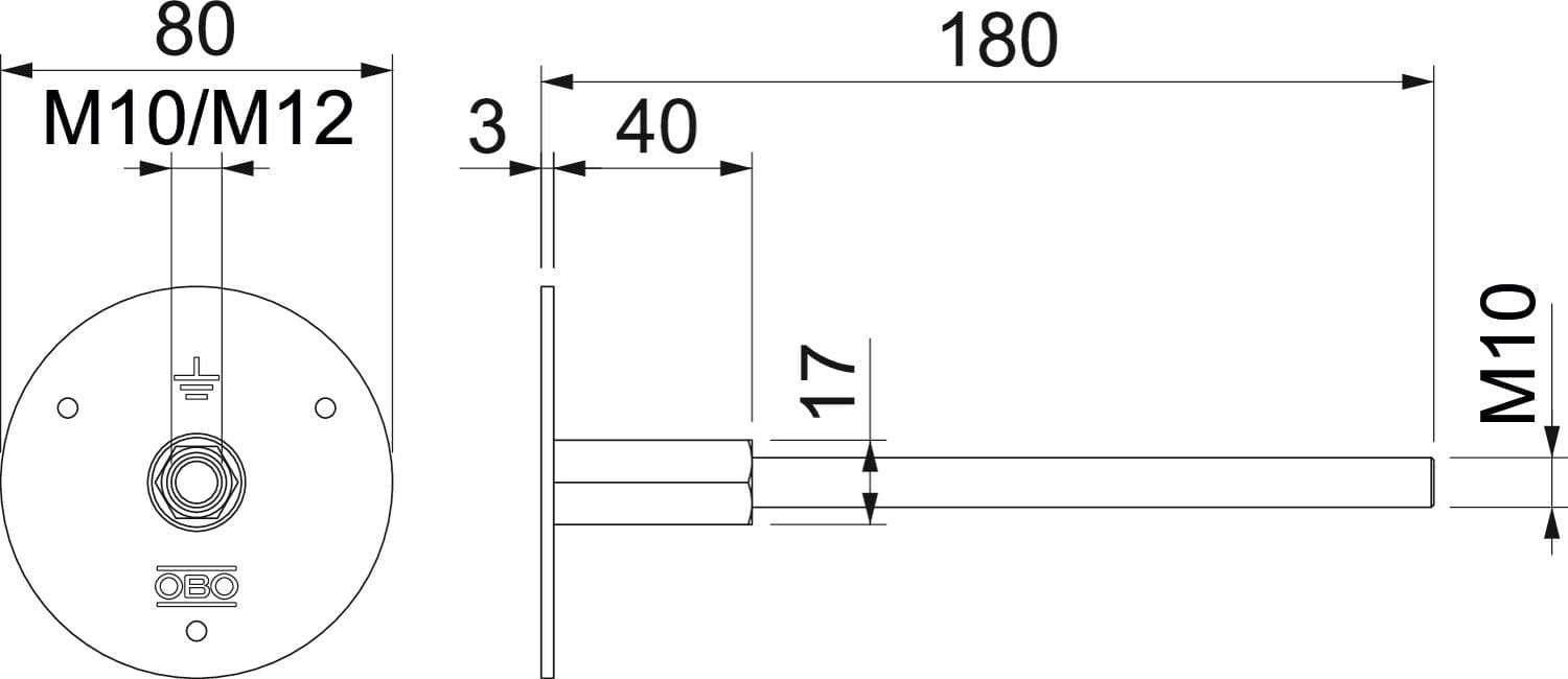 OBO BETTERMANN - 205 DG L180 V4A Punto fisso di messa a terra e doppia filettatura M10/M12 Acciaio, INOX A4 1.4404. 5420022