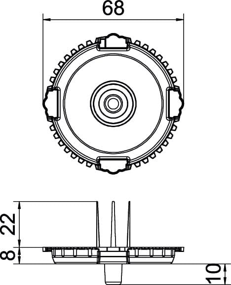 Coperchio per proteggere la scatola da incasso durante l'intonacatura. Rosso, con setole di segnalazione per la determinazione della posizione, centraggio per corona, linguette per la rimozione.