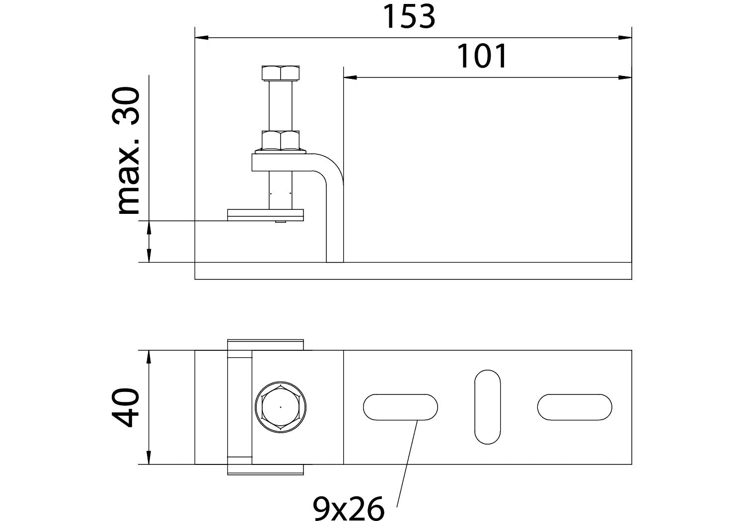 OBO BETTERMANN - Dispositivo di fissaggio in acciaio INOX A2 1.4301 per spessori fino a 28 mm, dimensioni 153x40x44mm, senza trattamento aggiuntivo. 6003887
