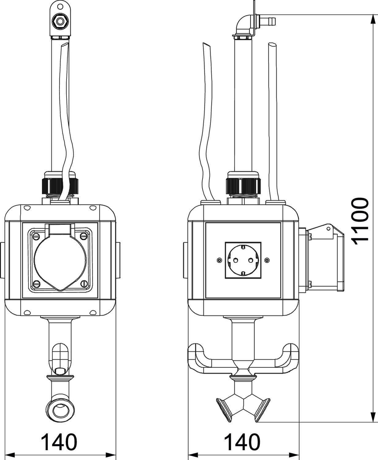 Alloggiamento equipaggiato e precablato con 1 m di tubo da 1/2'' e raccordo per tubo flessibile dell'aria compressa da 13 x 3,5 mm e ripartitore a 2 vie da 1/2'', con occhiello di aggancio, maniglia a gancio e 4 piastre di copertura.Equipaggiato come segue:3 prese Schuko a 1 via da 16 A / 250 V con protezione dal contatto diretto elevata, precablate a un circuito a corrente alternata, connessione mediante 1 morsetto a 3 poli, 1 presa CEE da 16 A / 415 V, con parete divisoria per la separazione dei circuiti di corrente.
