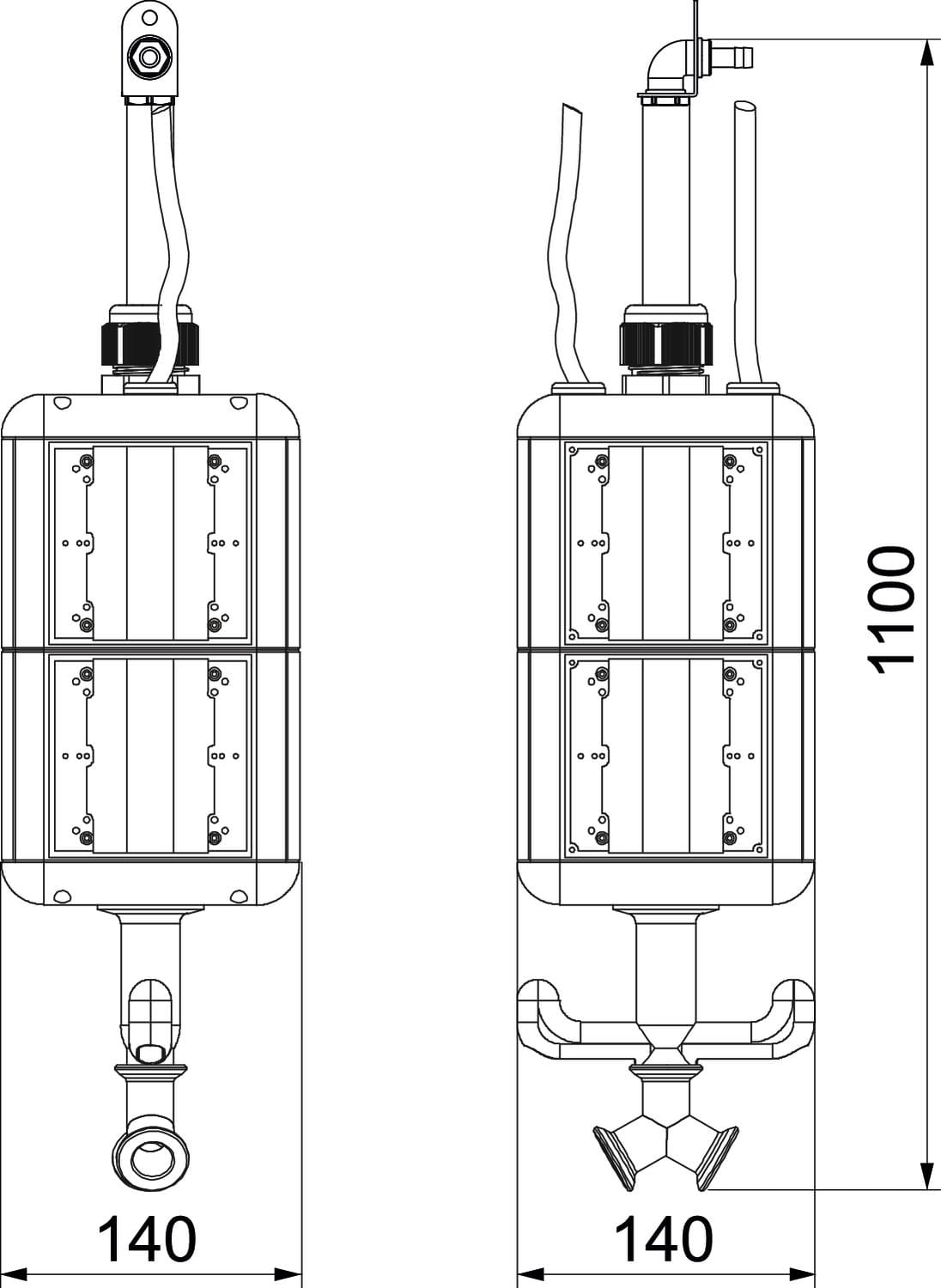 Alloggiamento vuoto con 1 m di tubo da 1/2'' e raccordo per tubo flessibile dell'aria compressa da 13 x 3,5 mm e ripartitore a 2 vie da 1/2''. Con occhiello di aggancio e maniglia a gancio, per il montaggio di dispositivi di azionamento elettrici con divisorio accluso. Senza piastre di copertura.
