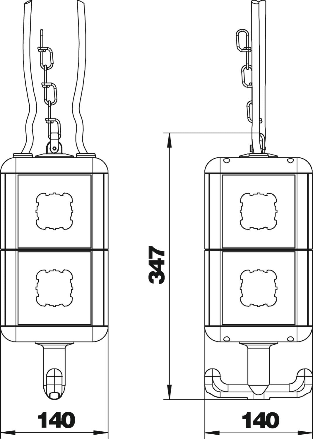 Alloggiamento vuoto con occhiello di aggancio e maniglia a gancio, per il montaggio di 8 dispositivi di azionamento elettrici con divisorio accluso. Con 8 piastre di copertura per apparecchi da incasso con anello di supporto sotto intonaco o staffa di supporto.