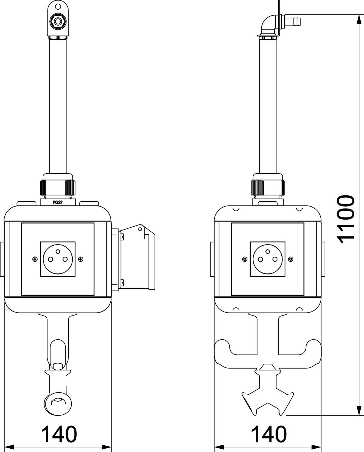 Alloggiamento equipaggiato e precablato con 1 m di tubo da 1/2'' e raccordo per tubo flessibile dell'aria compressa da 13 x 3,5 mm e ripartitore a 2 vie da 1/2'', con occhiello di aggancio, maniglia a gancio e 4 piastre di copertura.Equipaggiato come segue:3 prese Schuko con perno di messa a terra a 1 via da 16 A / 250 V con protezione dal contatto diretto elevata, precablate a un circuito a corrente alternata, connessione mediante 1 morsetto a 3 poli, 1 presa CEE da 16 A / 415 V, con parete divisoria per la separazione dei circuiti di corrente.