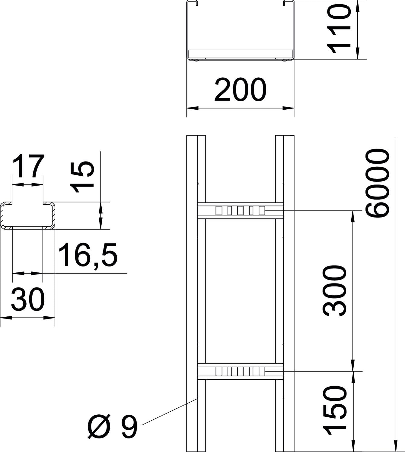 OBO BETTERMANN - Passerella traversini g.portata sponda laterale forata 110x200x6000 acciaio zincato in continuo. 6311008
