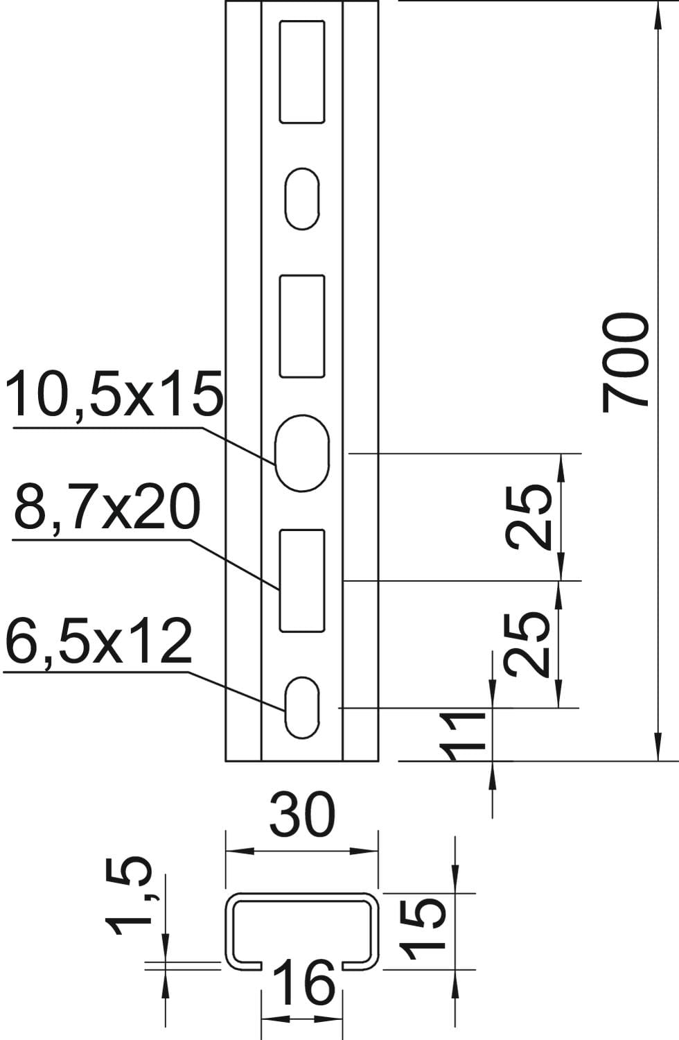 OBO BETTERMANN - Profilato a C asolata, acciaio zincato a caldo per immersione, foro 16 mm, dimensioni 700x30x15. 1109839
