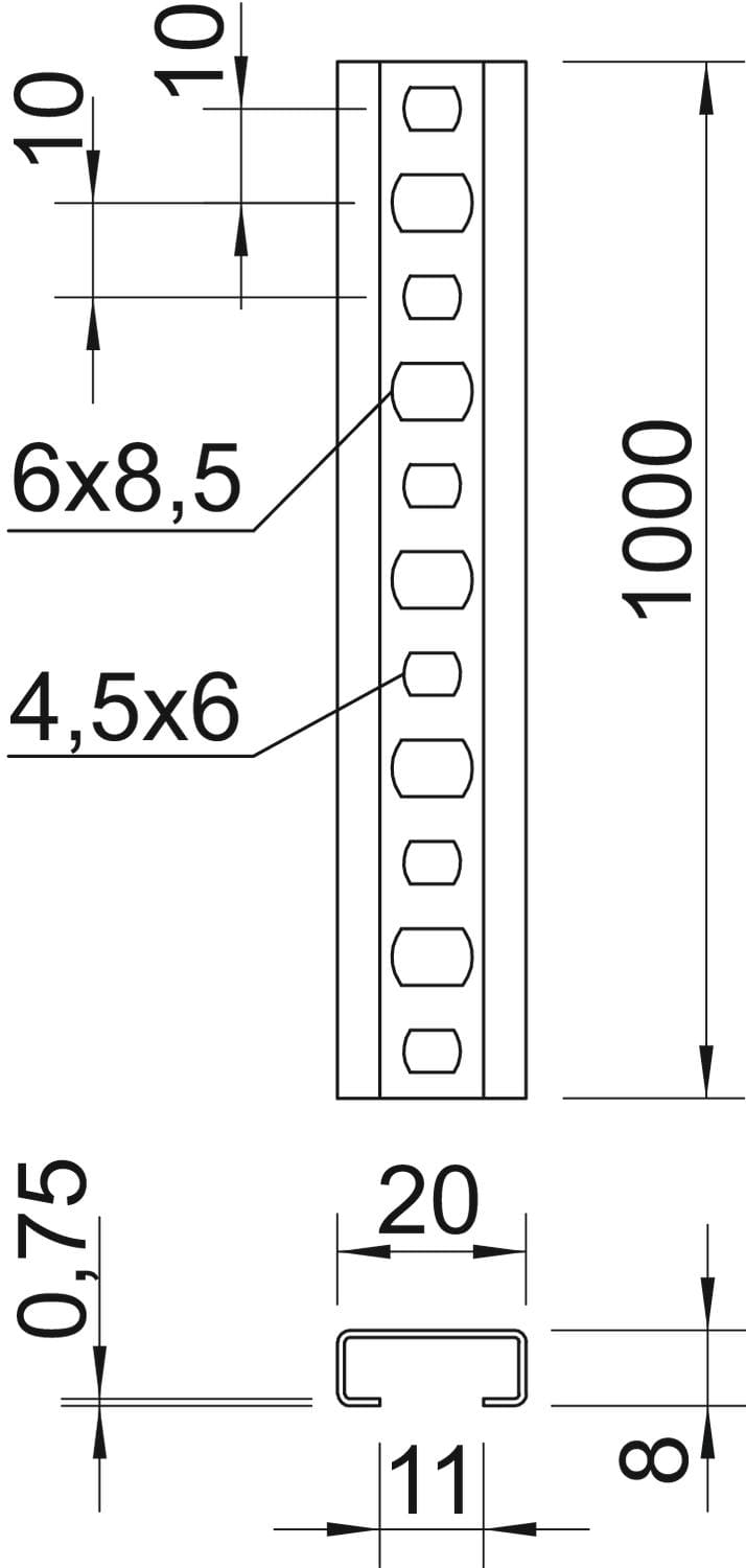 OBO BETTERMANN - Profilato a C asolata, foro 11mm 1000x20x8 in Acciaio zincato continuo. 1105906