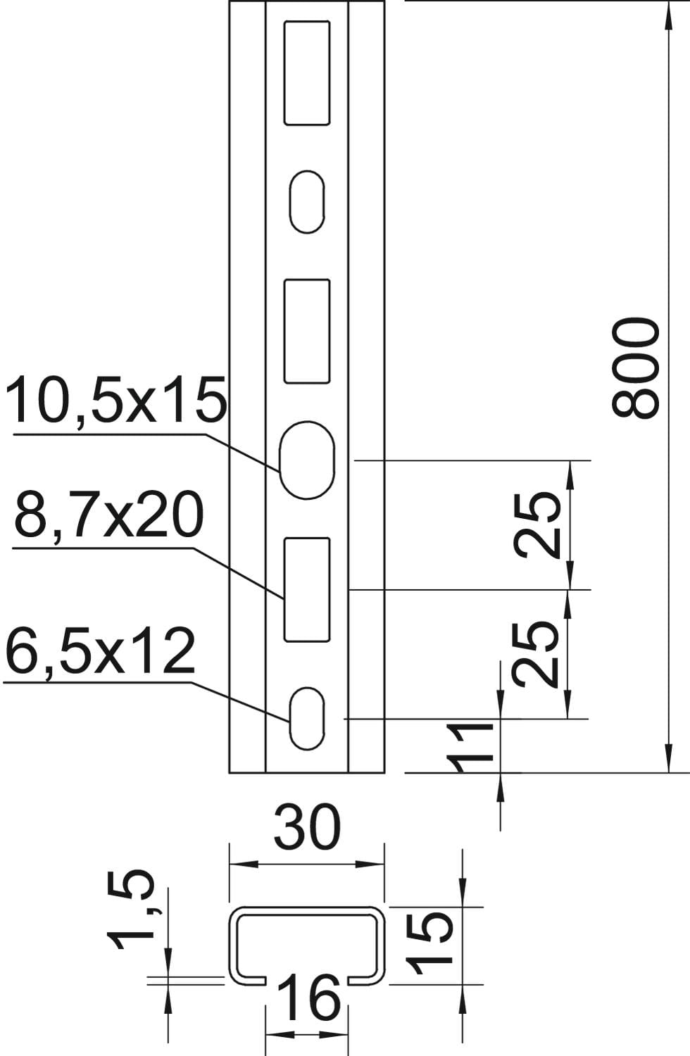 OBO BETTERMANN - Profilato a C asolata, foro 16 mm 800x30x15 in Acciaio zincato a caldo per immersione. 1109847