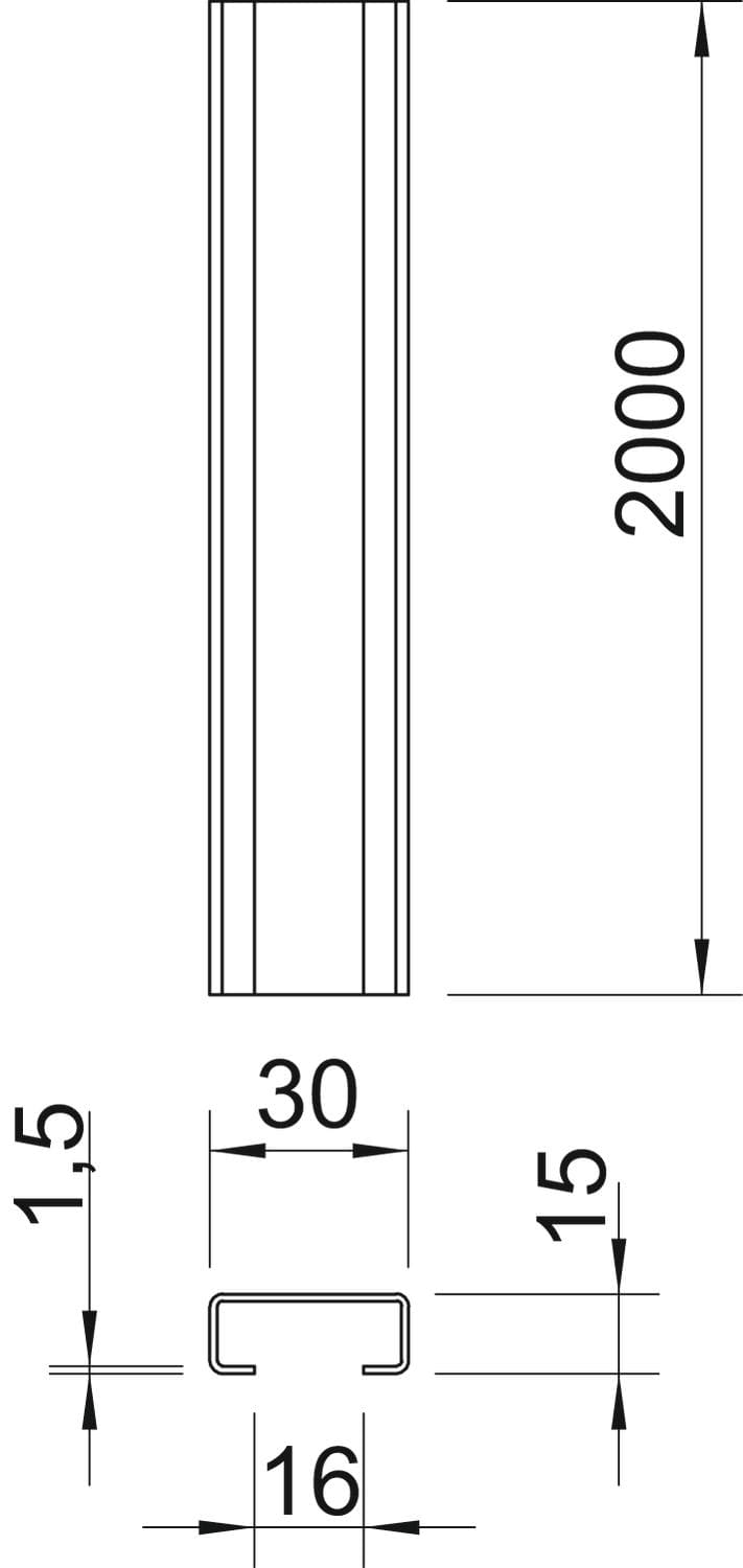 OBO BETTERMANN - Profilato a C non forato, slot 16mm 2000x30x15 in Acciaio zincato continuo.