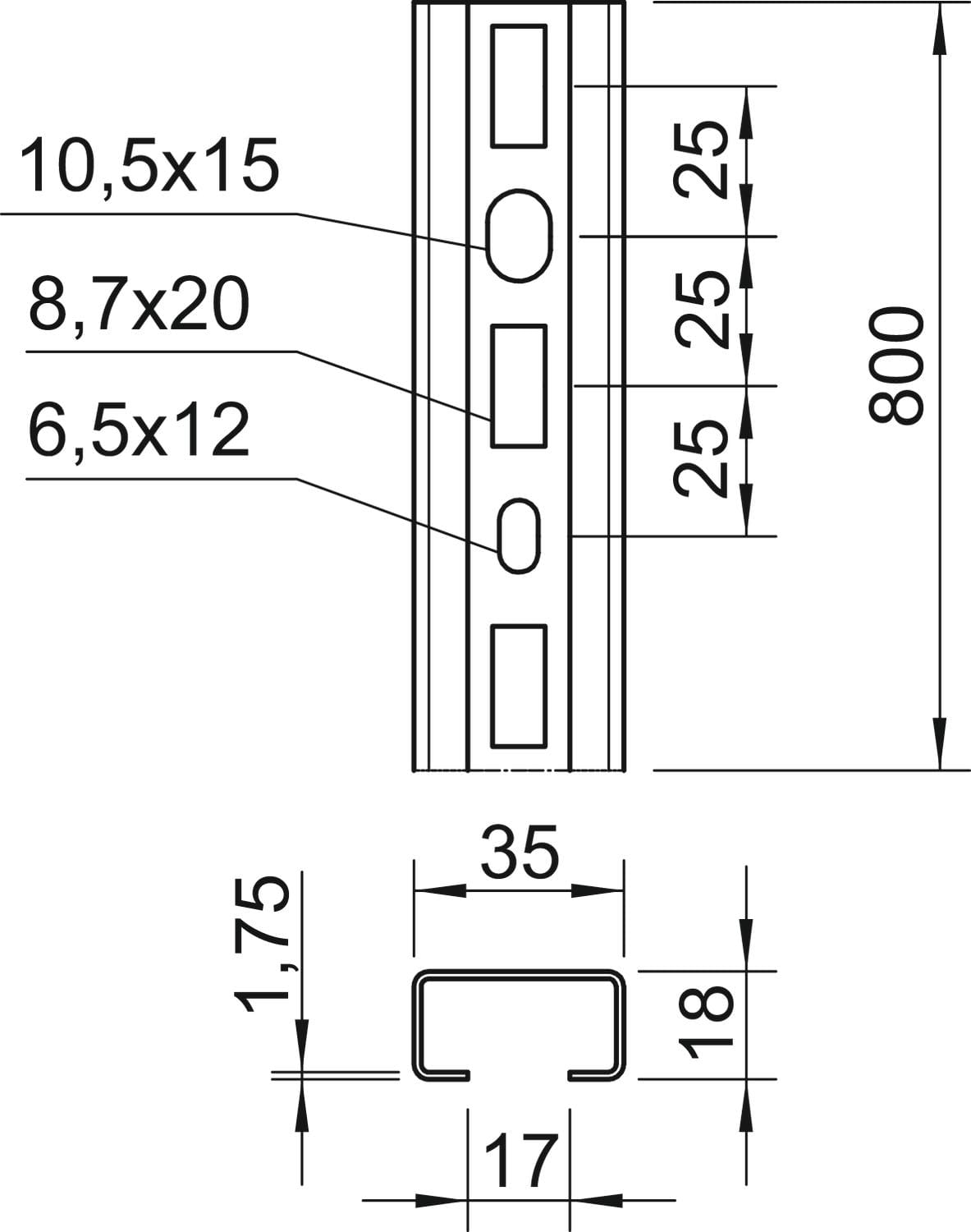 OBO BETTERMANN - Profilato asolata, foro 17mm 800x35x18 in Acciaio zincato continuo. 1104427