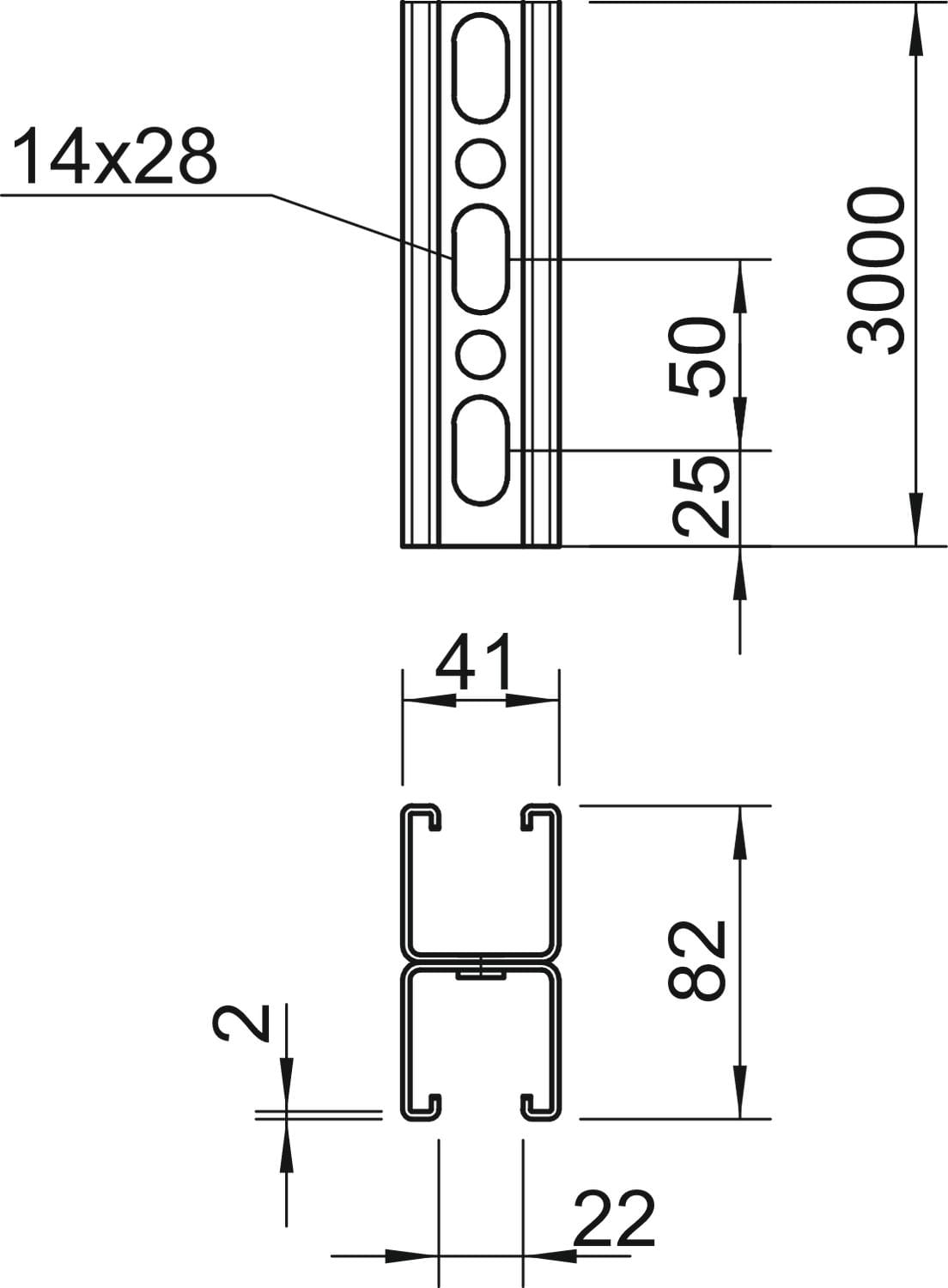 OBO BETTERMANN - Profilato asolata, foro 22mm 3000x41x82 Acciaio INOX A2 1.4301 non trattato, ulteriore trattamento. 1122682