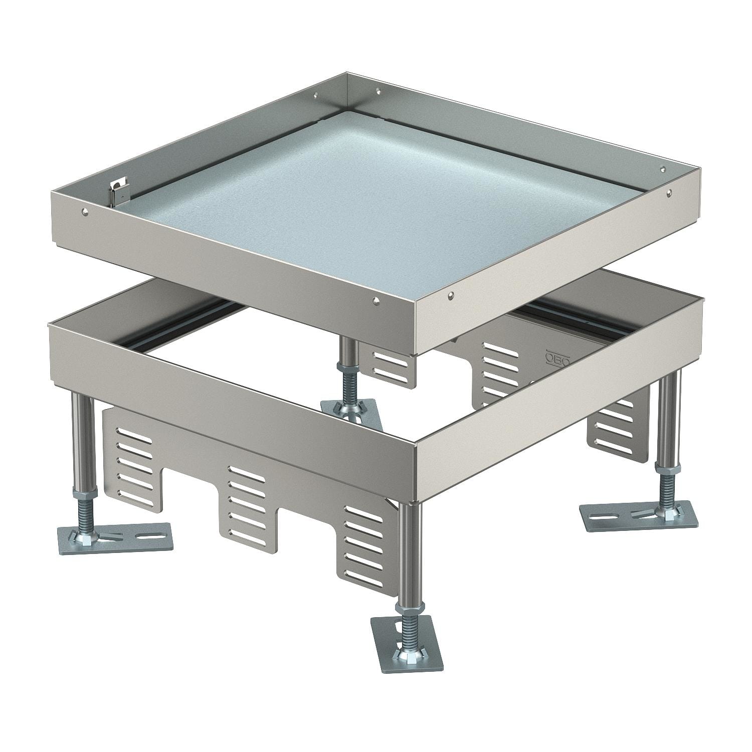 Le cassette per carichi pesanti quadrate livellabili sono indicate per incassare gli apparecchi a livello pavimento in pavimenti sopraelevati e con intercapedini, così come in tutti i tipi di sistemi di installazione a pavimento in pavimenti trattati a secco o a umido in caso di elevati carichi dinamici. Le versioni delle cassette sono adatte per carichi statici fino a 10 kN (classe SL 1). Il bordo superiore della cassetta può essere regolato tramite il livellamento dall'interno in modo da coincidere perfettamente col bordo superiore del rivestimento del pavimento circostante. In caso di montaggio in un sistema di condotti, quest'ultimo deve disporre di un'adeguata apertura di montaggio. Una scatola di derivazione sotto pavimento necessita per questo del relativo coperchio di montaggio con supporti per carichi pesanti e di supporti per carichi pesanti separati negli angoli. Le cassette sono fabbricate in acciaio inossidabile. Tutte le cassette contengono una piastra in lamiera di acciaio dello spessore di 8 mm per sopportare in sicurezza gli eventuali carichi. Sono disponibili cassette adatte a spessori del rivestimento pavimento diversi, di 20 e 25 mm.