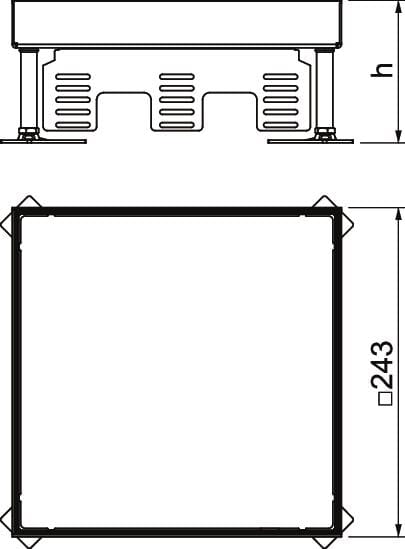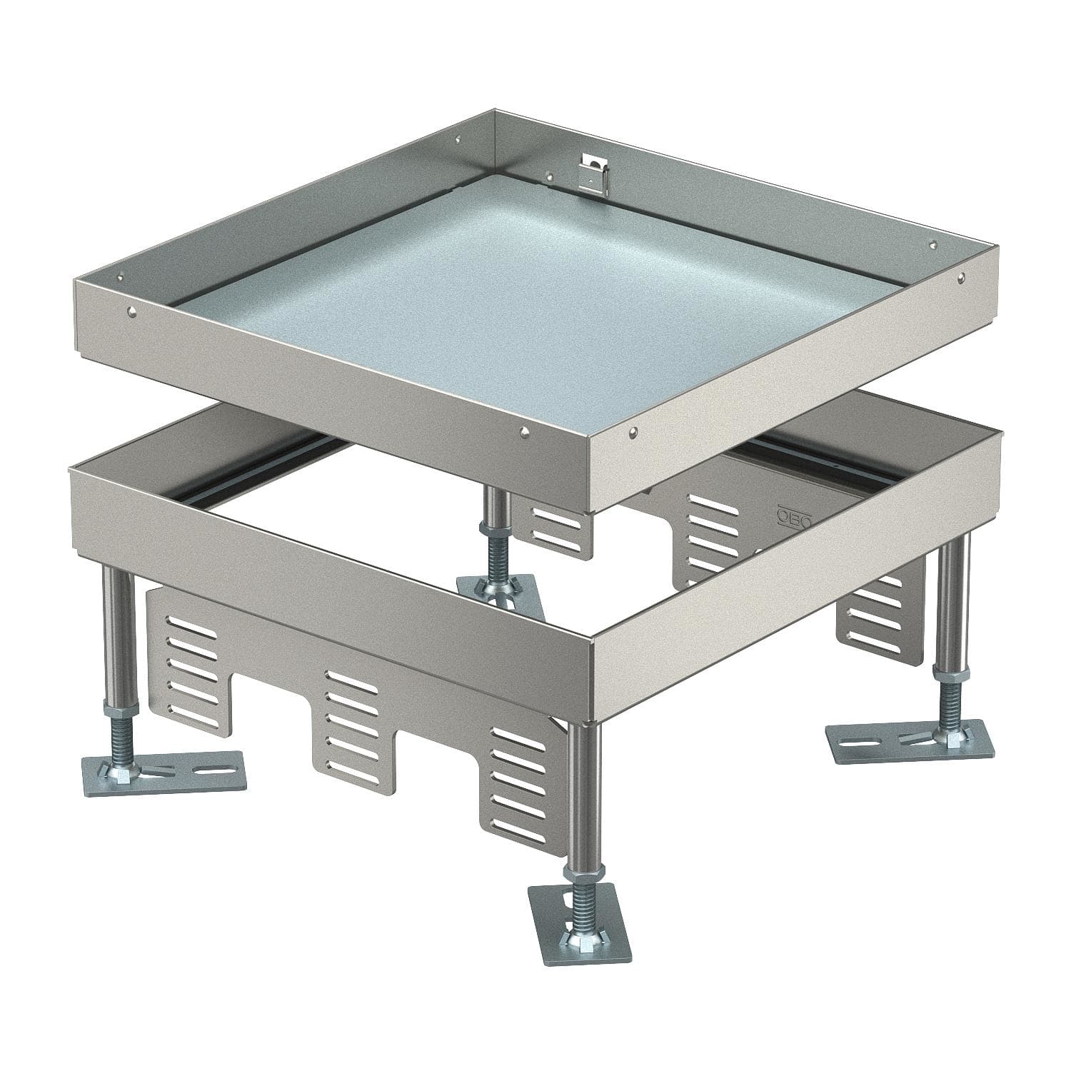 Le cassette livellabili quadrate sono adatte per incassare gli apparecchi a livello pavimento in pavimenti sopraelevati e con intercapedini, così come in tutti i tipi di sistemi di installazione a pavimento. In base alla versione, sono indicate per pavimenti trattati a secco, a umido o con lavaggio bagnato. Il bordo superiore della cassetta può essere regolato tramite un livellamento dall'interno in modo da coincidere perfettamente col bordo superiore del rivestimento del pavimento circostante. In caso di montaggio in un sistema di condotti, quest'ultimo deve disporre di un'adeguata apertura di montaggio. Una scatola di connessione sotto pavimento necessita di un coperchio di montaggio con la corrispondente apertura d'incasso. Le cassette sono fabbricate in acciaio o ottone. Tutte le cassette contengono una piastra in lamiera di acciaio dello spessore di 4 mm per sopportare in sicurezza gli eventuali carichi. Sono disponibili cassette adatte a spessori del rivestimento del pavimento diversi, di 20 e 25 mm.