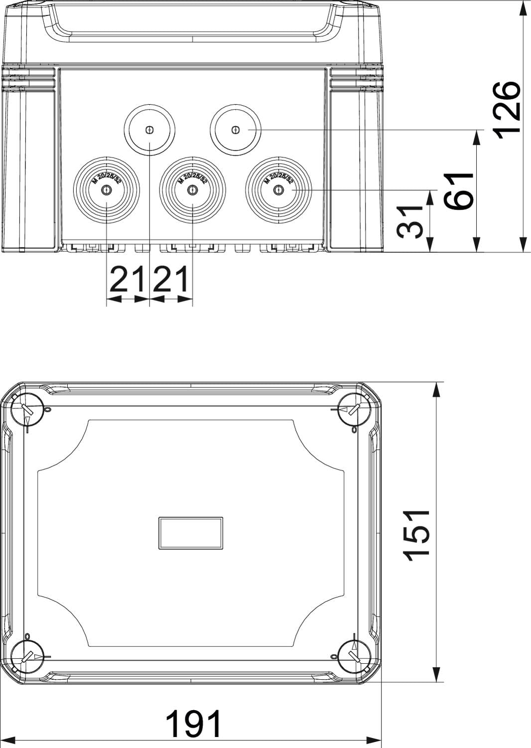Scatola di derivazione con morsettiera per il collegamento di cavi e linee in ambienti interni e ambienti esterni. Forma rettangolare con inserti di deviazione. Adatta per il montaggio su pareti e soffitti con la possibilità di fissaggio esterno e interno o il montaggio su sezioni angolari. Resistente agli urti IK09. Coperchio con chiusura rapida, piombabile. Costruito con materiali privi di alogeni e resistenti agli UV. Include 5 morsettiere con 4 posizioni di bloccaggio ciascuna. Scatola di derivazione a norma DIN EN 60670. Ignifugo secondo DIN EN 60695-2-11, temperatura di prova 650 °C. Resistenza agli urti IK09 secondo DIN EN 50102. Grado di protezione IP 67 a norma DIN EN 60529.