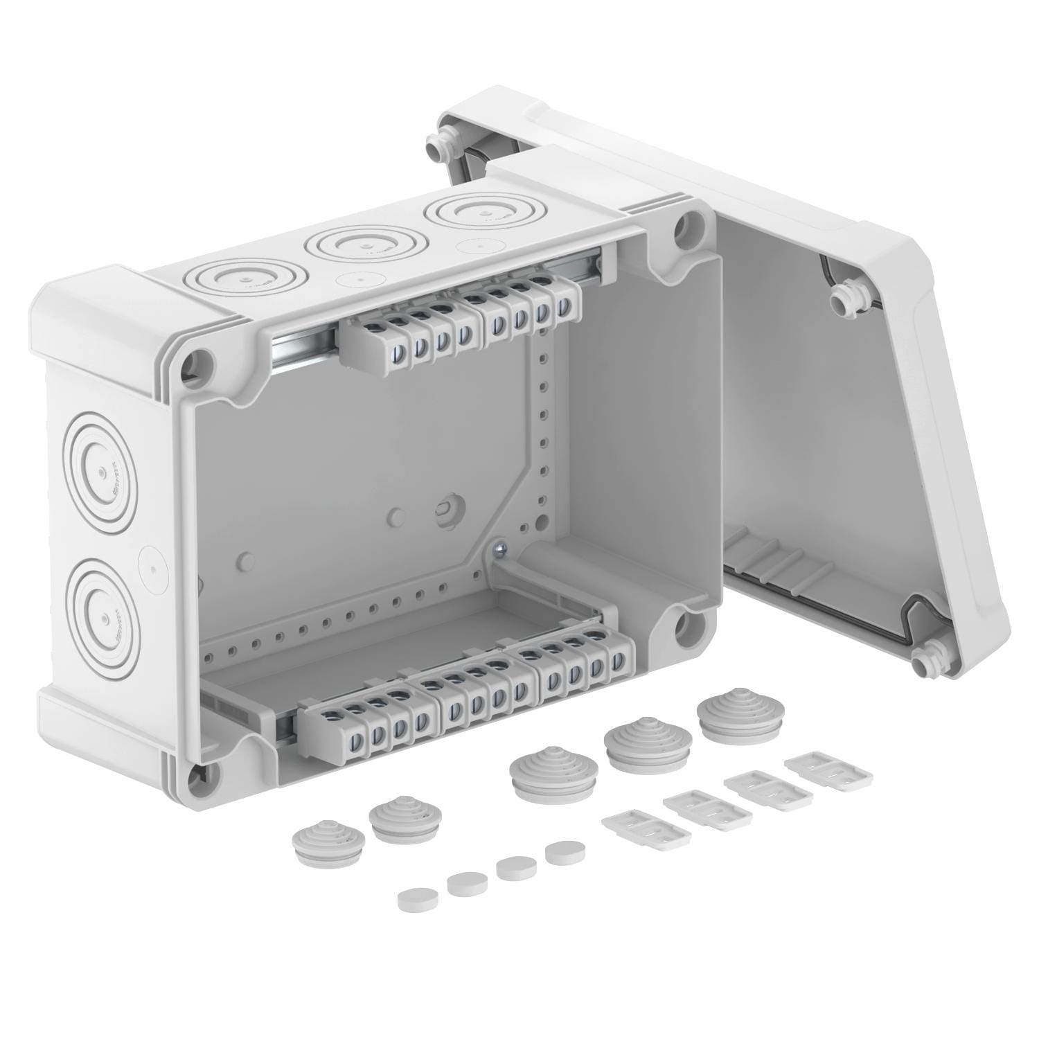 Scatola di derivazione con morsettiera per il collegamento di cavi e linee in ambienti interni e ambienti esterni. Forma rettangolare con inserti di deviazione. Adatta per il montaggio su pareti e soffitti con la possibilità di fissaggio esterno e interno o il montaggio su sezioni angolari. Particolarmente resistente agli urti con IK08. Coperchio con chiusura rapida, piombabile. Costruito con materiali privi di alogeni e resistenti agli UV. Include 5 morsettiere con 4 posizioni di bloccaggio ciascuna. Scatola di derivazione a norma DIN EN 60670. Ignifugo secondo DIN EN 60695-2-11, temperatura di prova 650 °C. Resistenza all'impatto IK08 a norma DIN EN 50102. Grado di protezione IP 67 a norma DIN EN 60529.