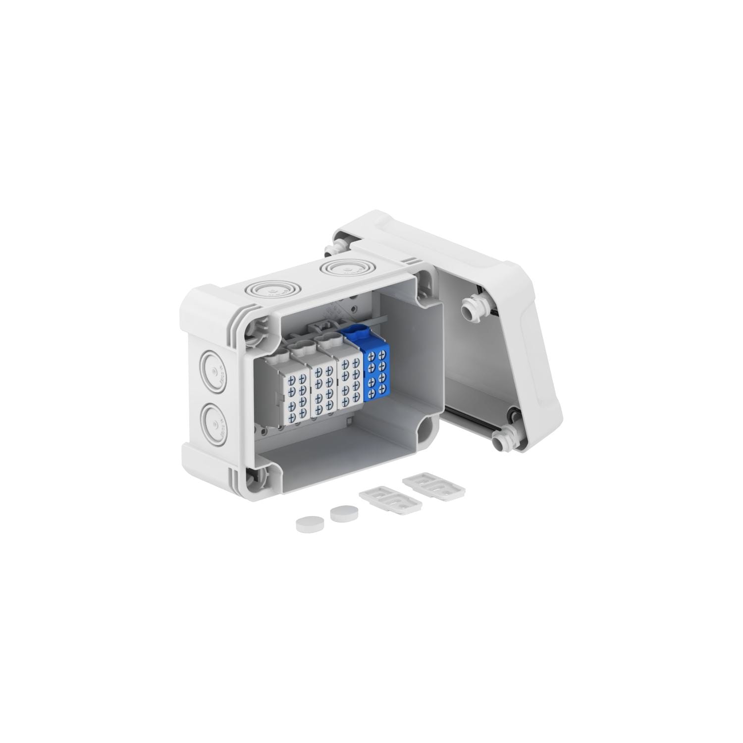 Scatola di derivazione con morsetto per il collegamento di cavi e linee in ambienti interni e ambienti esterni. Forma rettangolare con inserti di deviazione. Adatta per il montaggio su pareti e soffitti con la possibilità di fissaggio esterno e interno o il montaggio su sezioni angolari. Resistente agli urti IK09. Coperchio con chiusura rapida, piombabile. Costruito con materiali privi di alogeni e resistenti agli UV. Include morsetti di derivazione della linea principale a 4 poli, ciascuno con sezioni trasversali di collegamento del conduttore di 2 x 25 mm² + 2 x 16 mm² per polo. Scatola di derivazione del cavo secondo DIN EN 60670. Ignifugo secondo DIN EN 60695-2-11, temperatura di prova 650 °C. Resistenza agli urti IK09 secondo DIN EN 50102. Grado di protezione IP 67 a norma DIN EN 60529.