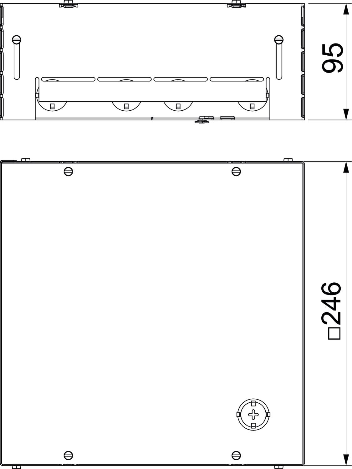 Scatola massetto quadrata per alloggiamento GES9-3 per l'impiego in pavimenti a massetto e in ambienti interni. Con aperture preforate per tubi (M25) su tutti i lati. Fornito con un coperchio di protezione per il montaggio. La profondità di montaggio minima è 95 mm, il campo di livellamento + 30 mm.