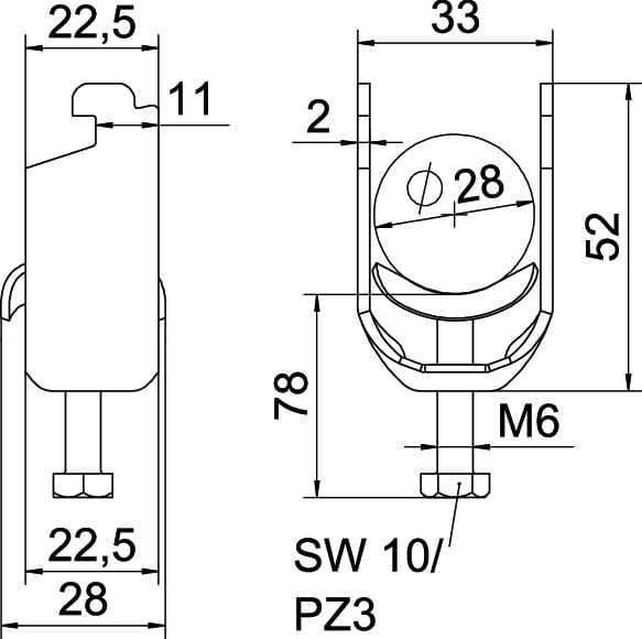 Staffa reggicavo con ancoraggio tipo N, coppa in metallo con bordi arrotondati per proteggere il cavo. Per il montaggio verticale e orizzontale di 1 cavo singolo su profilato a C. Per asola 11 - 12 mm. Con coppa di pressione, testa a vite esagonale universale SW10, intaglio a croce e a taglio. Per il montaggio in ambiente interno ed esterno. Si raccomanda l'uso della controcoppa.