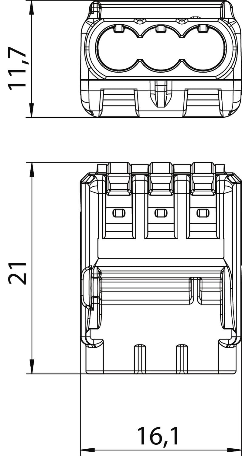 Verificato secondo EN 60998 Morsetto senza vite per il collegamento di conduttori elettrici. Il tipo di conduttore può essere, a scelta, flessibile, a treccia o rigido. Con l'impiego di conduttori rigidi, non è necessaria l'apertura della leva di sblocco. Il conduttore può essere inserito direttamente nel morsetto. Per estrarre il conduttore, è sufficiente aprire la leva di sblocco. Il filo si estrae poi senza problemi. Sezione nominale: 3 x 0,2 - 2,5 mm² conduttori a filo singolo o multiplo Tensione nominale 450 V Corrente nominale 24 A Lunghezza spelatura: 9 mm (+1 mm) Apertura di prova: cerca fase e spina di prova (max. Ø 2 mm) ben accessibile sulla parte superiore del morsetto Temperatura ambiente max. secondo EN 60998: 85°C.
