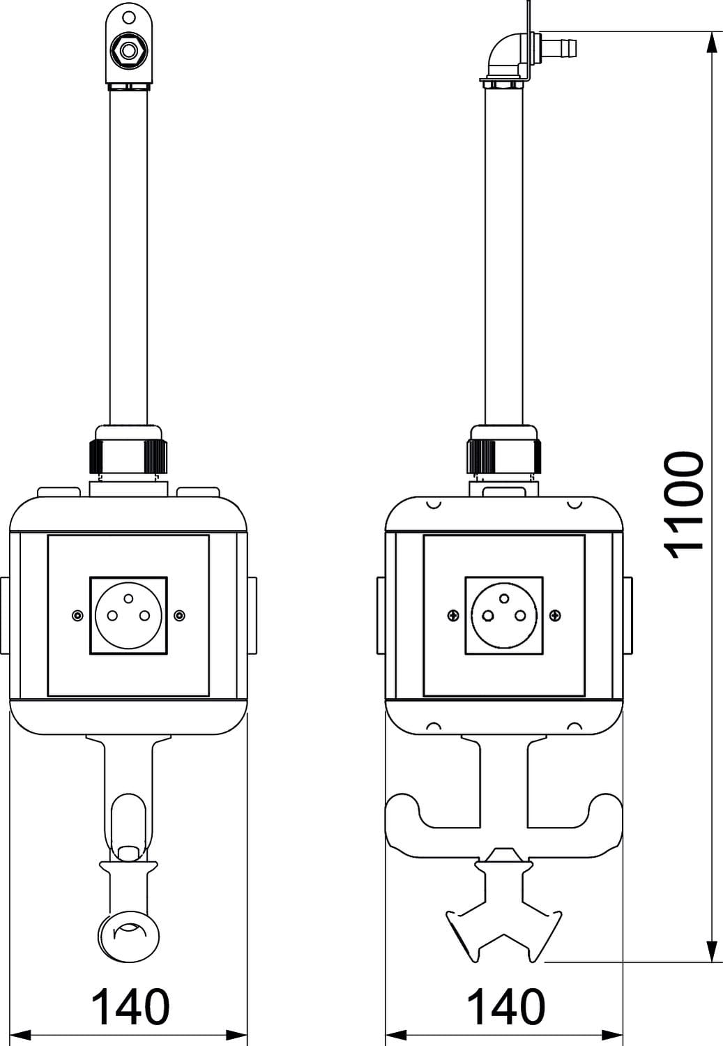 Alloggiamento equipaggiato e precablato con 1 m di tubo da 1/2'' e raccordo per tubo flessibile dell'aria compressa da 13 x 3,5 mm e ripartitore a 2 vie da 1/2'', con occhiello di aggancio, maniglia a gancio e 4 piastre di copertura.Equipaggiato come segue:4 prese Schuko con perno di messa a terra a 1 via da 16 A / 250 V con protezione dal contatto diretto elevata, precablate a due circuiti a corrente alternata, connessione mediante 2 morsetti a 3 poli, con parete divisoria per la separazione dei circuiti di corrente.