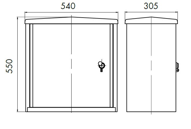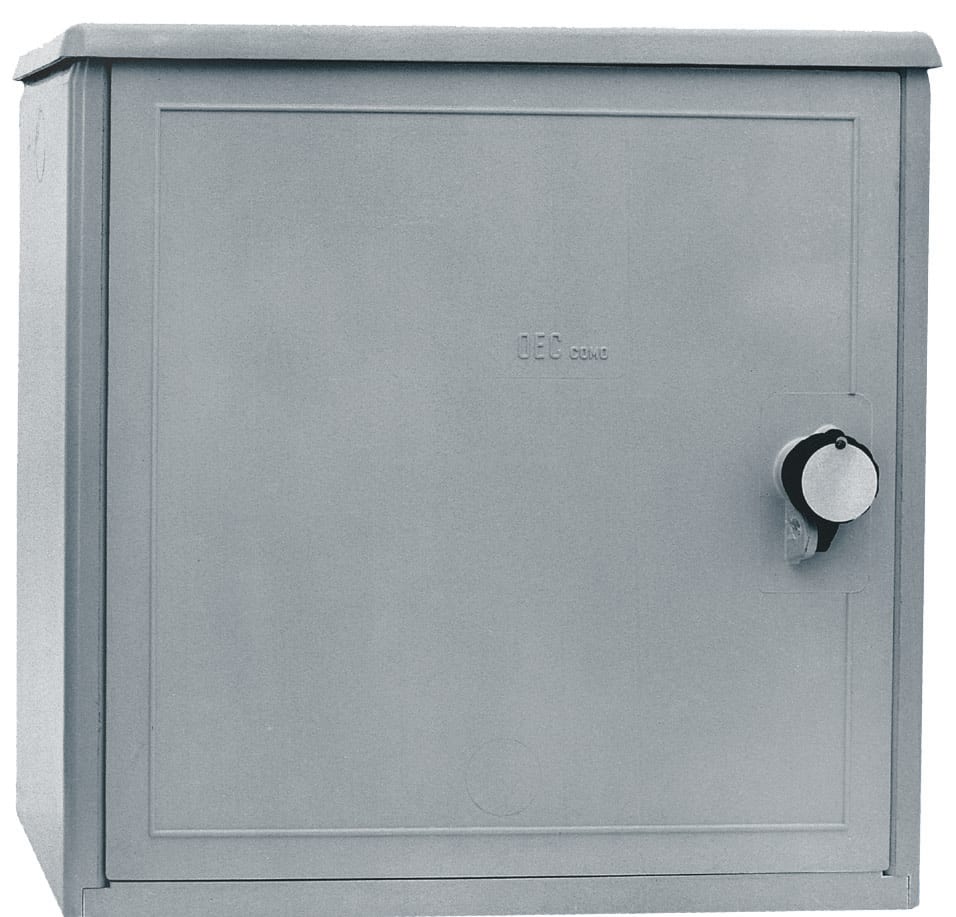 Lo sportello è liscio, incernierato, con apertura di 90° e possibilità di rimozione totale per facilitare l'accesso. È disponibile anche in versione con finestrella trasparente. La serratura è a tre punti di chiusura e può essere fornita con diverse tipologie di chiave (triangolare, a spillo, Yale o nazionale). L'aerazione interna è ottenuta tramite un labirinto tra il coperchio e le pareti perimetrali. Il contenitore può essere fissato a muro, su palo tramite staffa, a pavimento con telaio o a basamento con piastra di raccordo. Il lato inferiore è dotato di tre fori rivestiti in gomma per il passaggio e la protezione dei cavi. La fornitura standard prevede un fondo chiuso con fori per il passaggio dei cavi, con eccezione delle versioni senza tetto che hanno il fondo aperto.