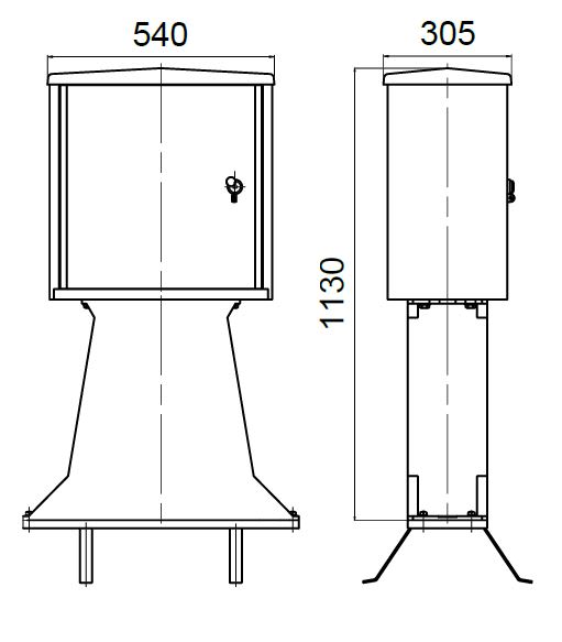 Lo sportello è liscio, incernierato, con apertura di 90° e possibilità di rimozione totale per facilitare l'accesso. È disponibile anche in versione con finestrella trasparente. La serratura è a tre punti di chiusura e può essere fornita con diverse tipologie di chiave (triangolare, a spillo, Yale o nazionale). L'aerazione interna è ottenuta tramite un labirinto tra il coperchio e le pareti perimetrali. Il contenitore può essere fissato a muro, su palo tramite staffa, a pavimento con telaio o a basamento con piastra di raccordo. Il lato inferiore è dotato di tre fori rivestiti in gomma per il passaggio e la protezione dei cavi. La fornitura standard prevede un fondo chiuso con fori per il passaggio dei cavi, con eccezione delle versioni senza tetto che hanno il fondo aperto.