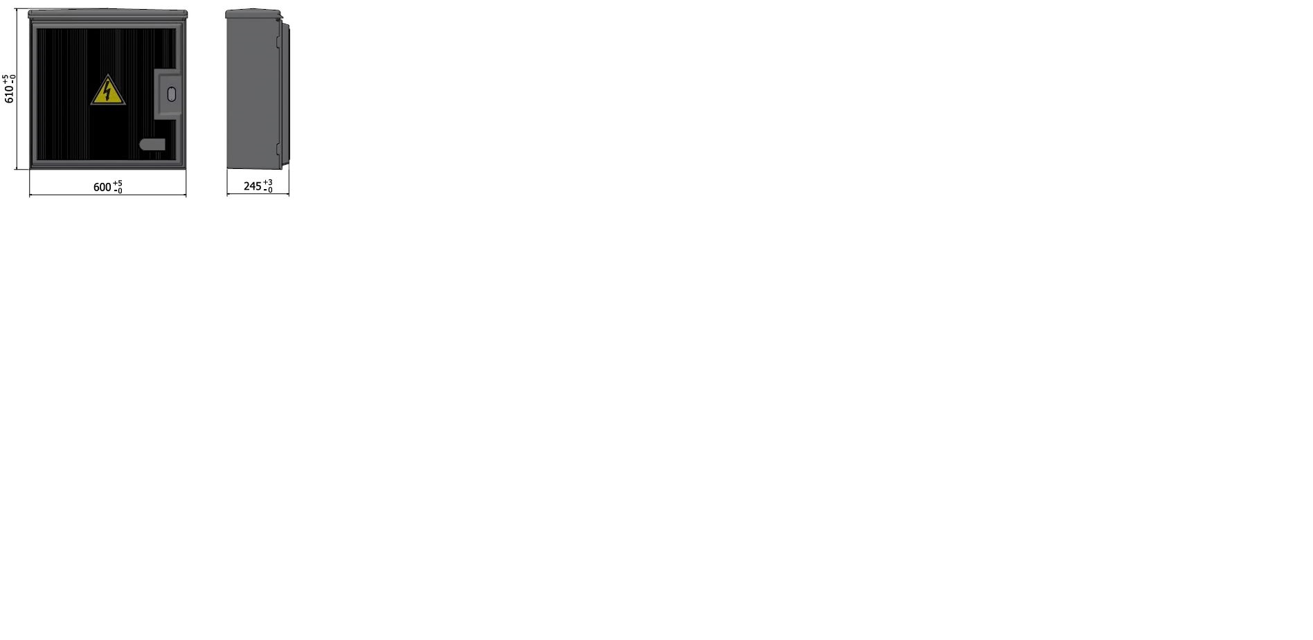 Lo sportello è liscio, incernierato, con apertura di 90° e possibilità di rimozione totale per facilitare l'accesso. È disponibile anche in versione con finestrella trasparente. La serratura è a tre punti di chiusura e può essere fornita con diverse tipologie di chiave (triangolare, a spillo, Yale o nazionale). L'aerazione interna è ottenuta tramite un labirinto tra il coperchio e le pareti perimetrali. Il contenitore può essere fissato a muro, su palo tramite staffa, a pavimento con telaio o a basamento con piastra di raccordo. Il lato inferiore è dotato di tre fori rivestiti in gomma per il passaggio e la protezione dei cavi. La fornitura standard prevede un fondo chiuso con fori per il passaggio dei cavi, con eccezione delle versioni senza tetto che hanno il fondo aperto.