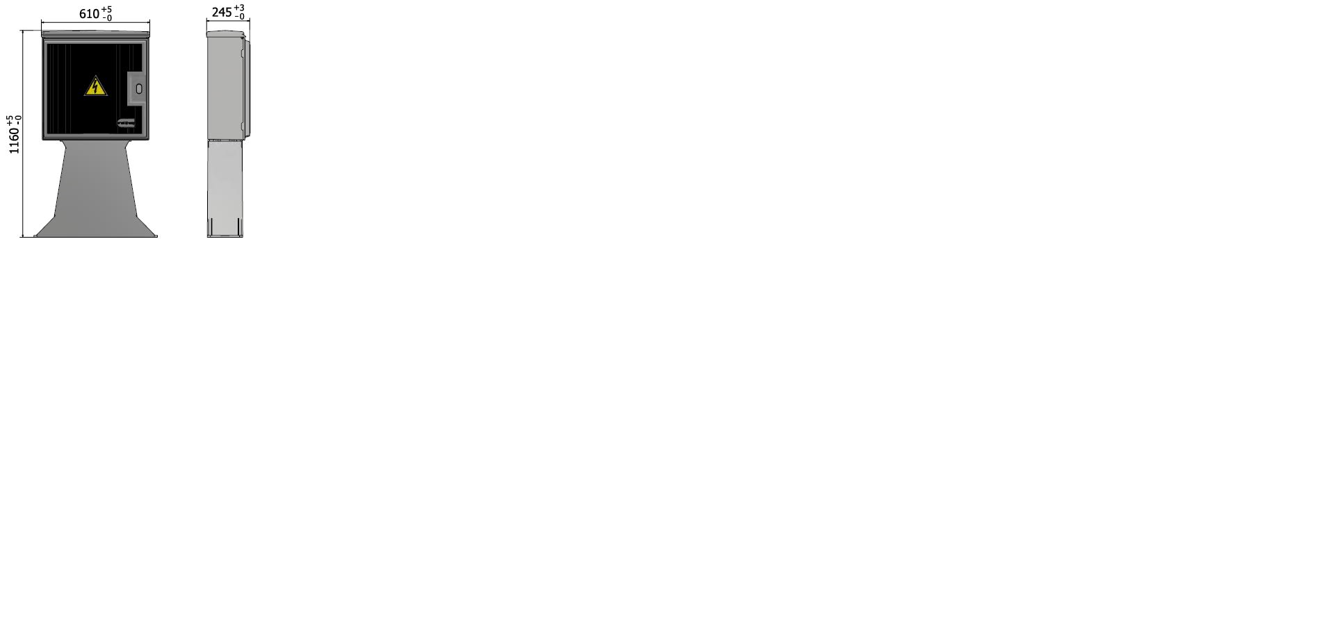 Lo sportello è liscio, incernierato, con apertura di 90° e possibilità di rimozione totale per facilitare l'accesso. È disponibile anche in versione con finestrella trasparente. La serratura è a tre punti di chiusura e può essere fornita con diverse tipologie di chiave (triangolare, a spillo, Yale o nazionale). L'aerazione interna è ottenuta tramite un labirinto tra il coperchio e le pareti perimetrali. Il contenitore può essere fissato a muro, su palo tramite staffa, a pavimento con telaio o a basamento con piastra di raccordo. Il lato inferiore è dotato di tre fori rivestiti in gomma per il passaggio e la protezione dei cavi. La fornitura standard prevede un fondo chiuso con fori per il passaggio dei cavi, con eccezione delle versioni senza tetto che hanno il fondo aperto.