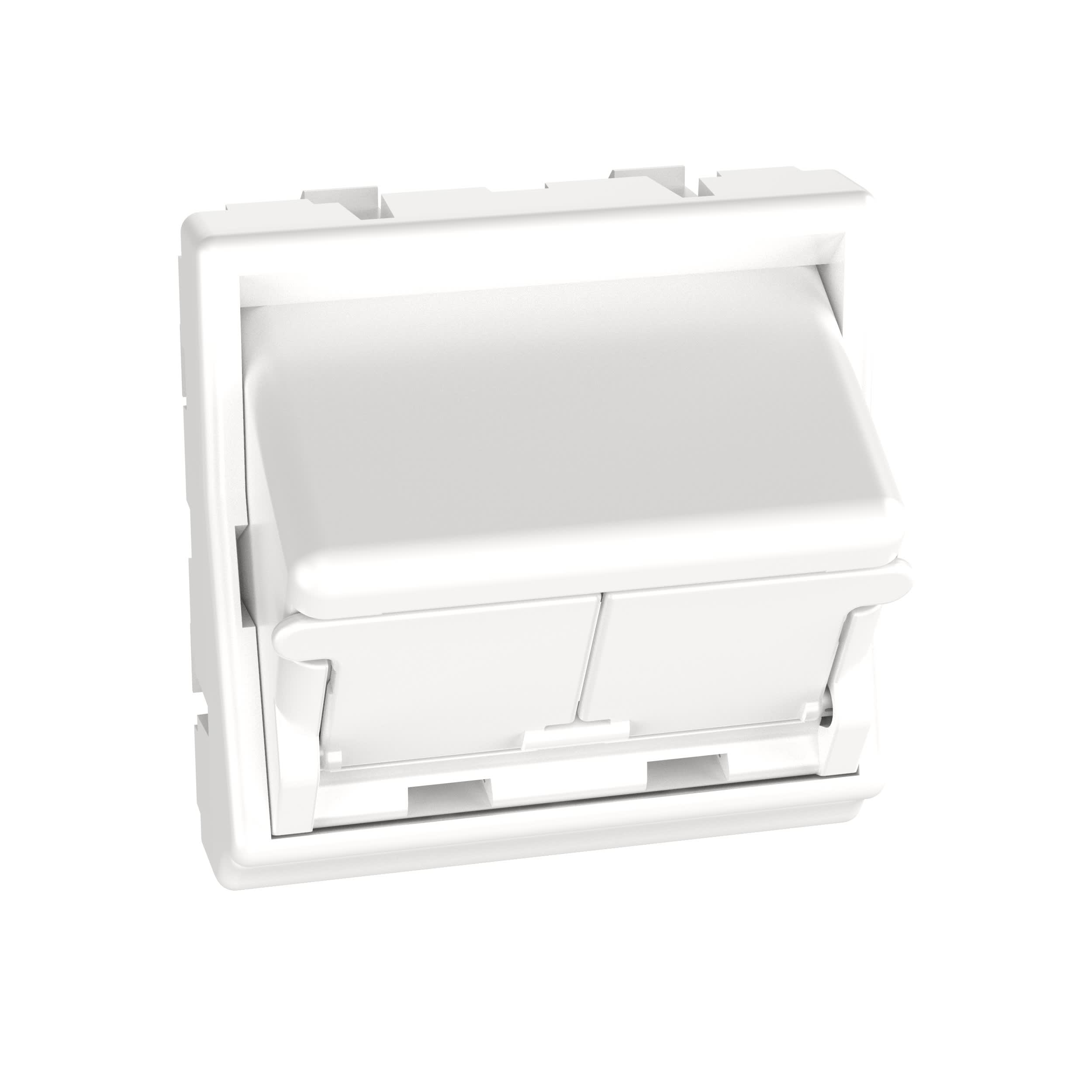The Mini-Com® 45mm x 45mm Faceplate Adapter accepts two Mini-Com Modules. The adapter mounts to standard 45mm x 45mm openings. It includes a frame and a half-size sloped, shuttered insert to improve bend radius and protect modules from dust and debris. The adapter can be identified with an adhesive label and is arctic white.