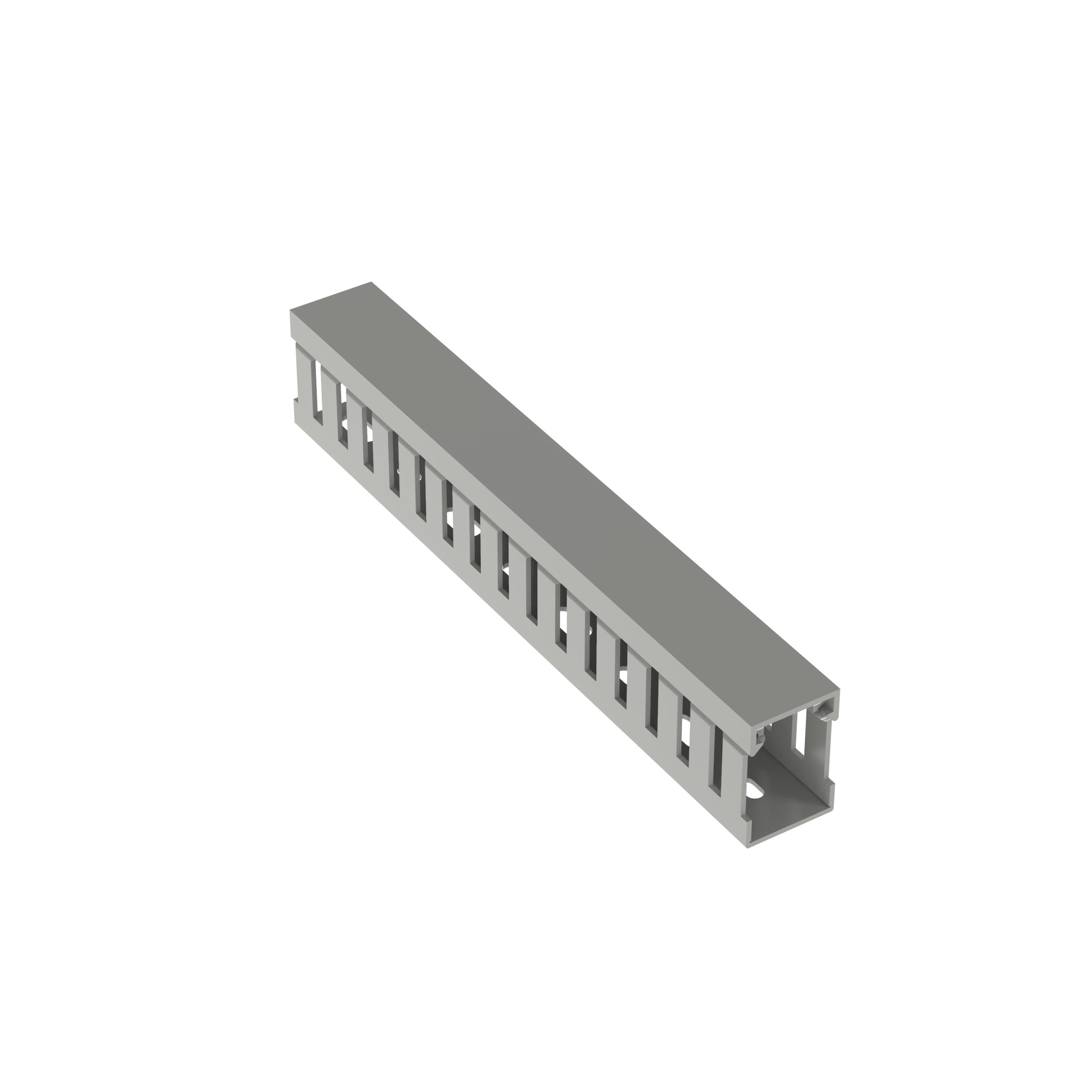 The MC25X37IG2 Panduct Lead-Free PVC Narrow Slot Wiring Duct is 24.6 mm x 35.8 mm (0.97'' x 1.41''). It features a narrow slot/finger design that closely matches the spacing of high-density components. Upper and lower scorelines allow for easy finger/sidewall section removal. UL 94 flame class of V-0 with a UL recognized continuous-use temperature up to 122°F (50°C). Mounting holes provided. Lead-free PVC. Cover included. Color - International Gray. 20 Meters (10 sticks each) - Bases & Covers per package.