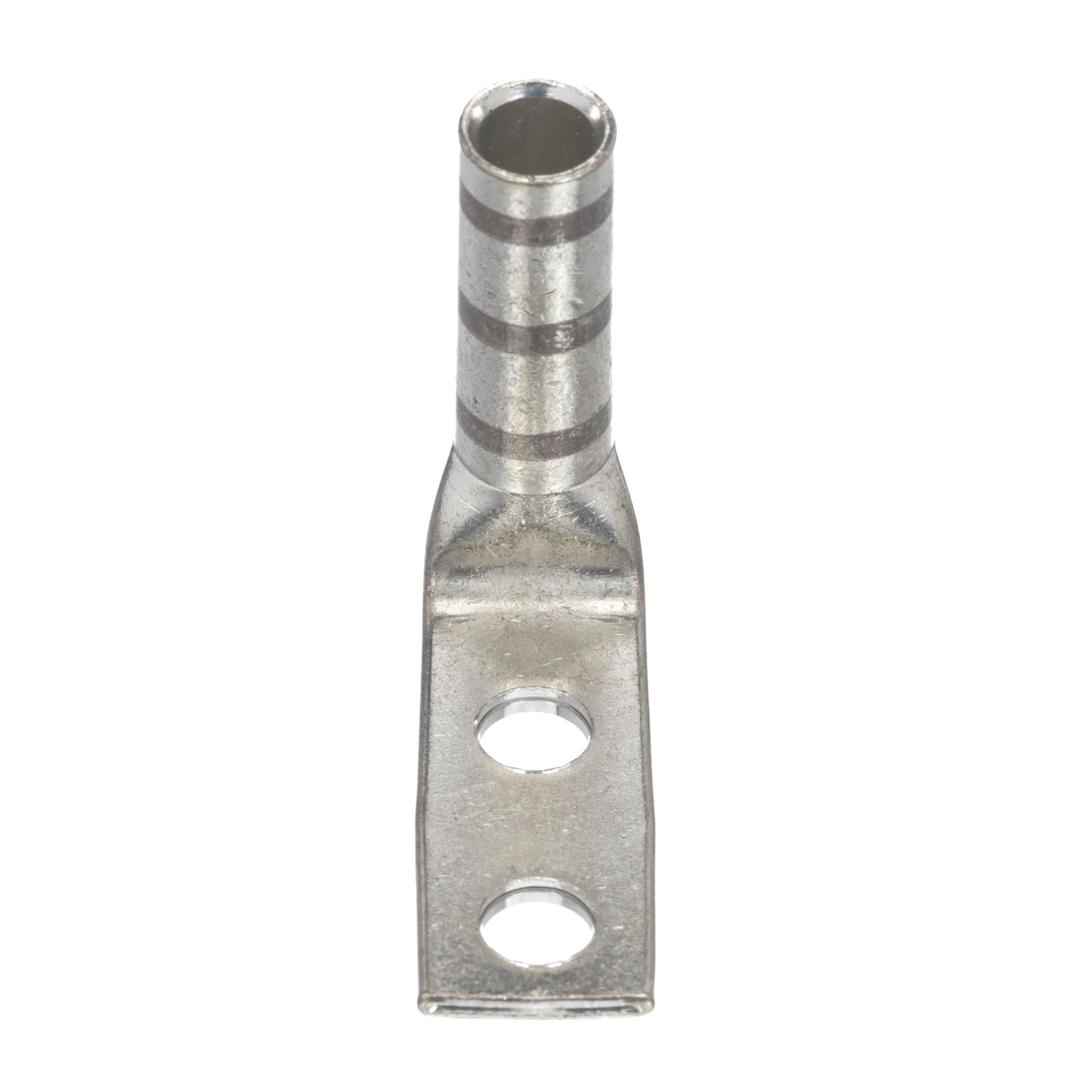 Two-hole, flex lug, long barrel, #4 AWG wire, 1/4 stud hole, .63 hole spacing, 90° angle tongue.