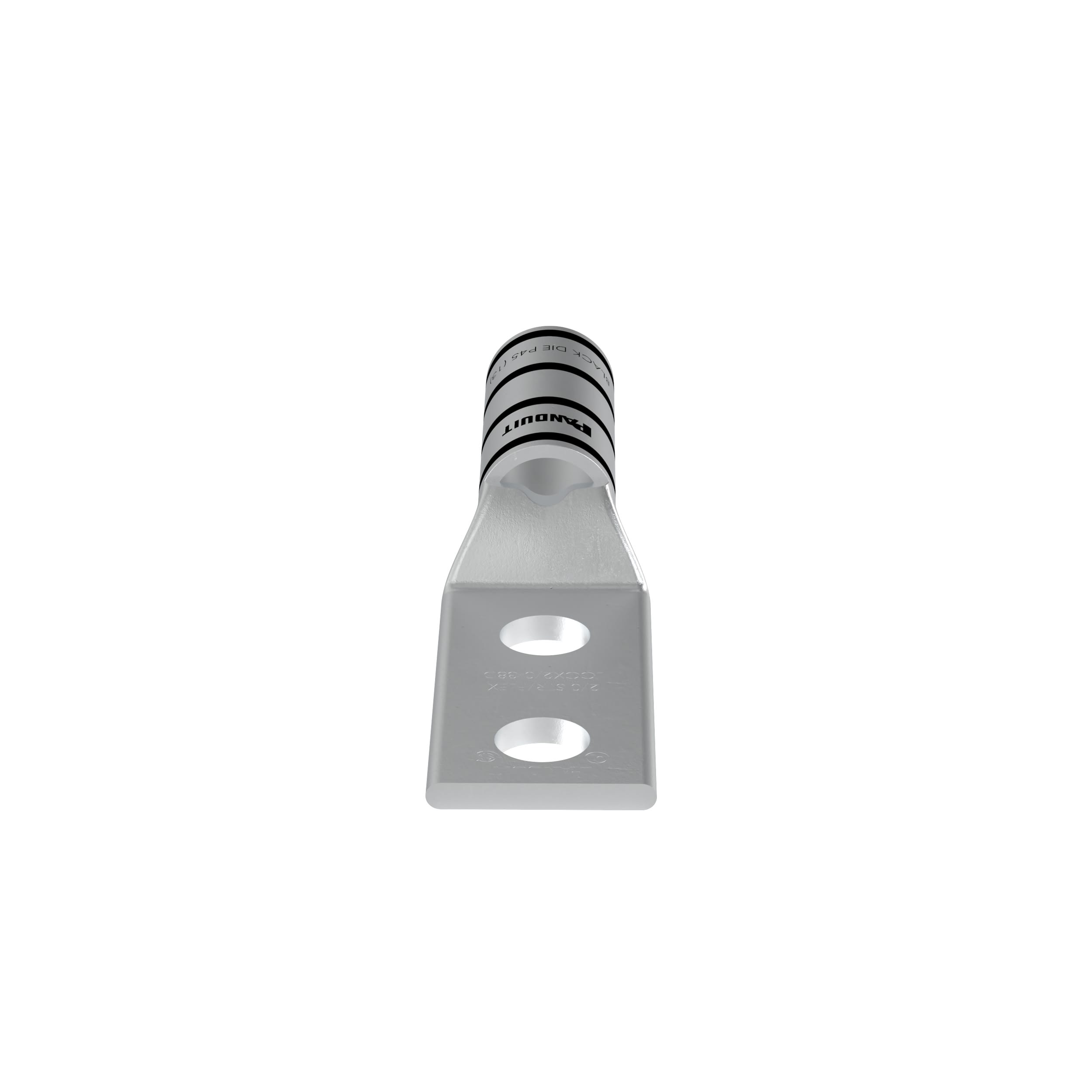 The LCCX2/0-38D-X Tin-Plated Copper Compression Lug, two-hole, long barrel, has color-coded barrels marked with Panduit and specified competitor die index numbers for proper crimp die selection. The long barrel maximizes the number of crimps and provides premium wire pull-out strength and performance. The generously beveled wire entry prevents bent back strands when inserting the conductor into the barrel. UL Listed and CSA Certified.