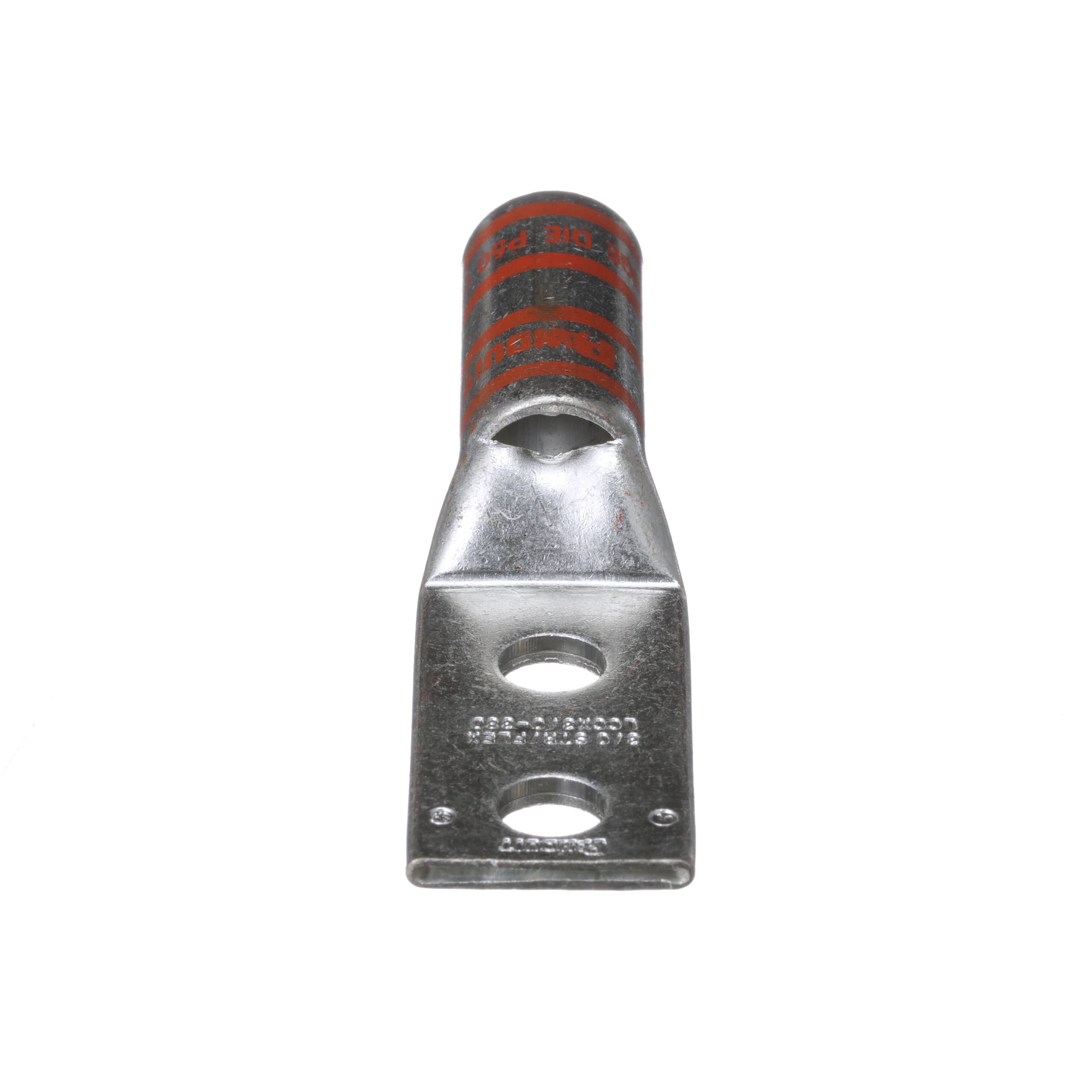 Two-hole, flex lug, long barrel, 3/0 AWG wire, 3/8 stud hole, 1 hole spacing.