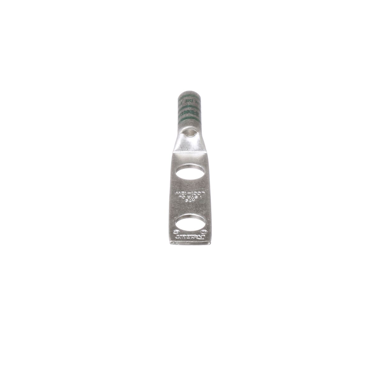 Two-hole, long barrel lug with window, #1 AWG wire, 1/2 stud hole, 1.75 hole spacing.