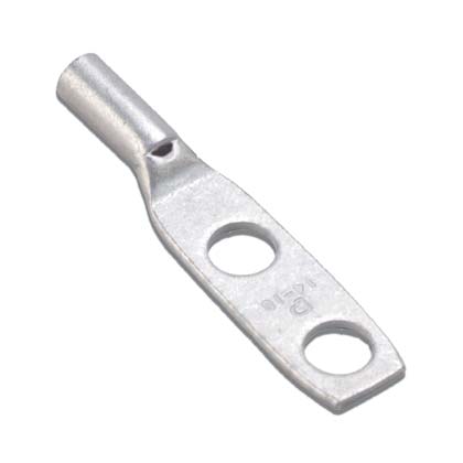 Two-hole, long barrel lug with window, #10 AWG wire, 1/4 stud hole, .75 hole spacing.