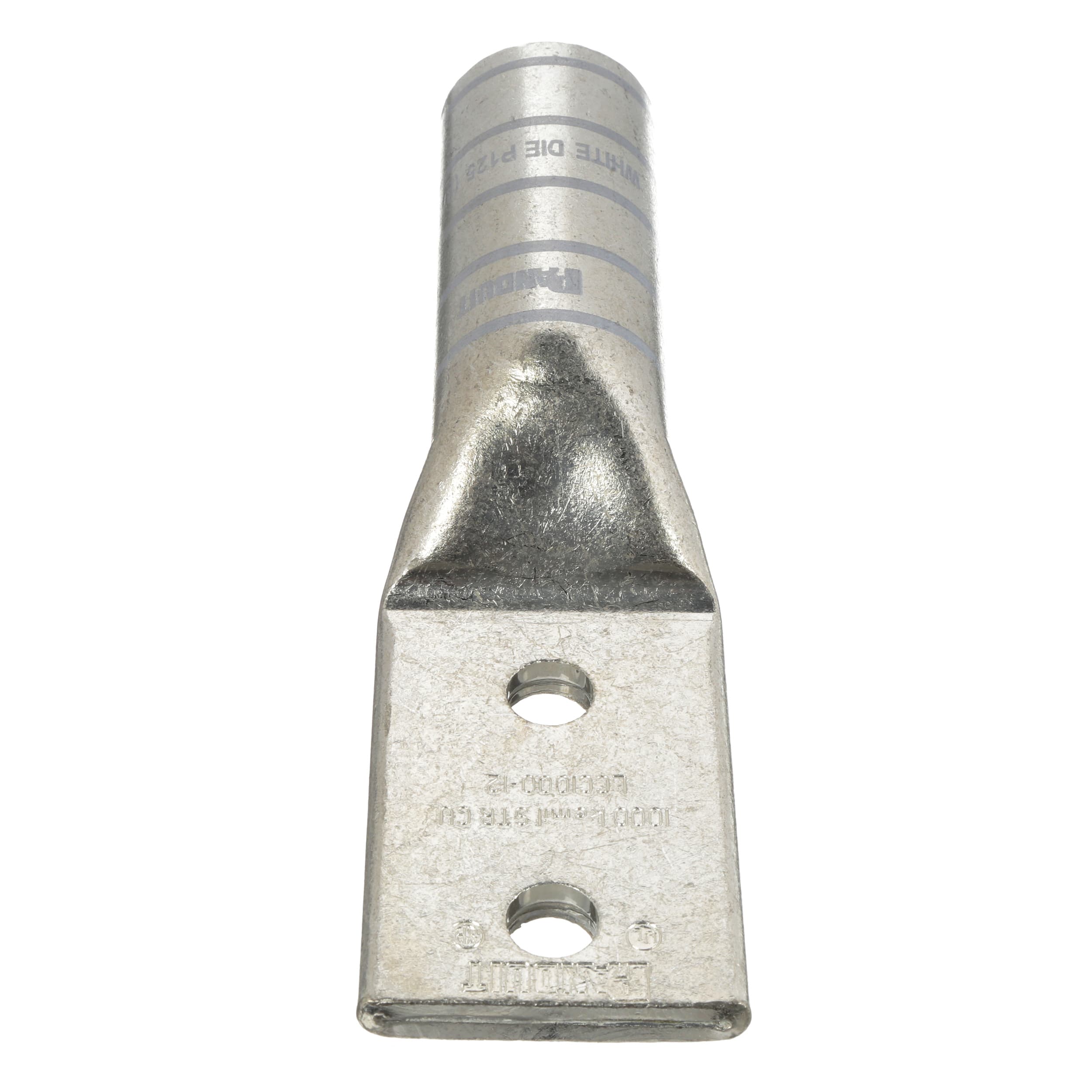 The LCC1000-12-3 Tin-Plated Copper Compression Lug, two-hole, long barrel, has color-coded barrels marked with Panduit and specified competitor die index numbers for proper crimp die selection. The long barrel maximizes the number of crimps and provides premium wire pull-out strength and performance. The generously beveled wire entry prevents bent back strands when inserting the conductor into the barrel. UL Listed and CSA Certified.