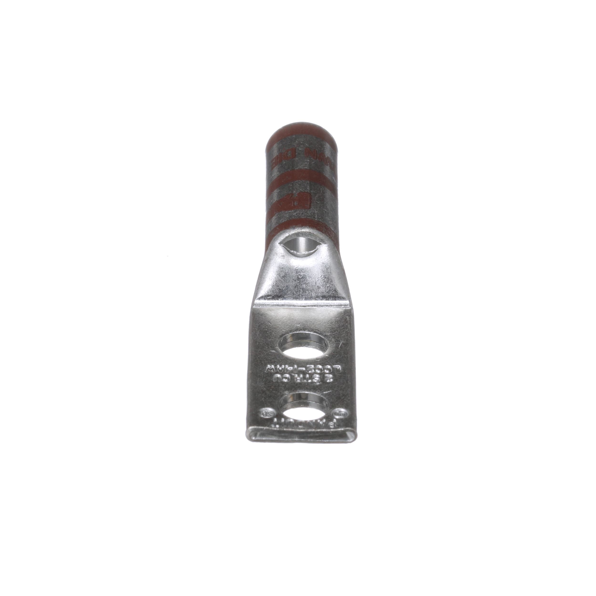 Two-hole, long barrel lug with window, #2 AWG wire, 1/4 stud hole, .63 hole spacing.