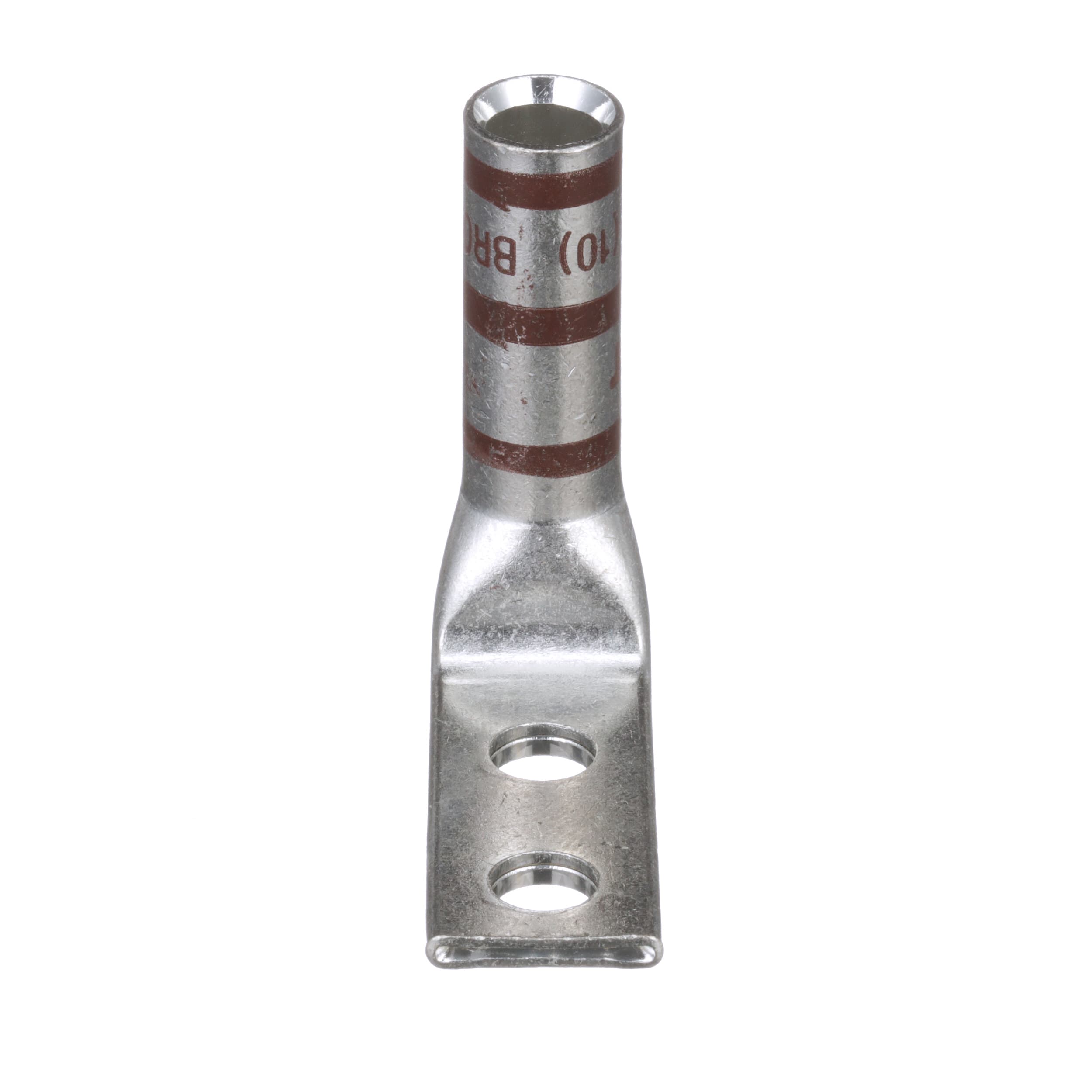 Two-hole, long barrel lug with window, #2 AWG wire, 1/4 stud hole, .63 hole spacing, 90° angle tongue.