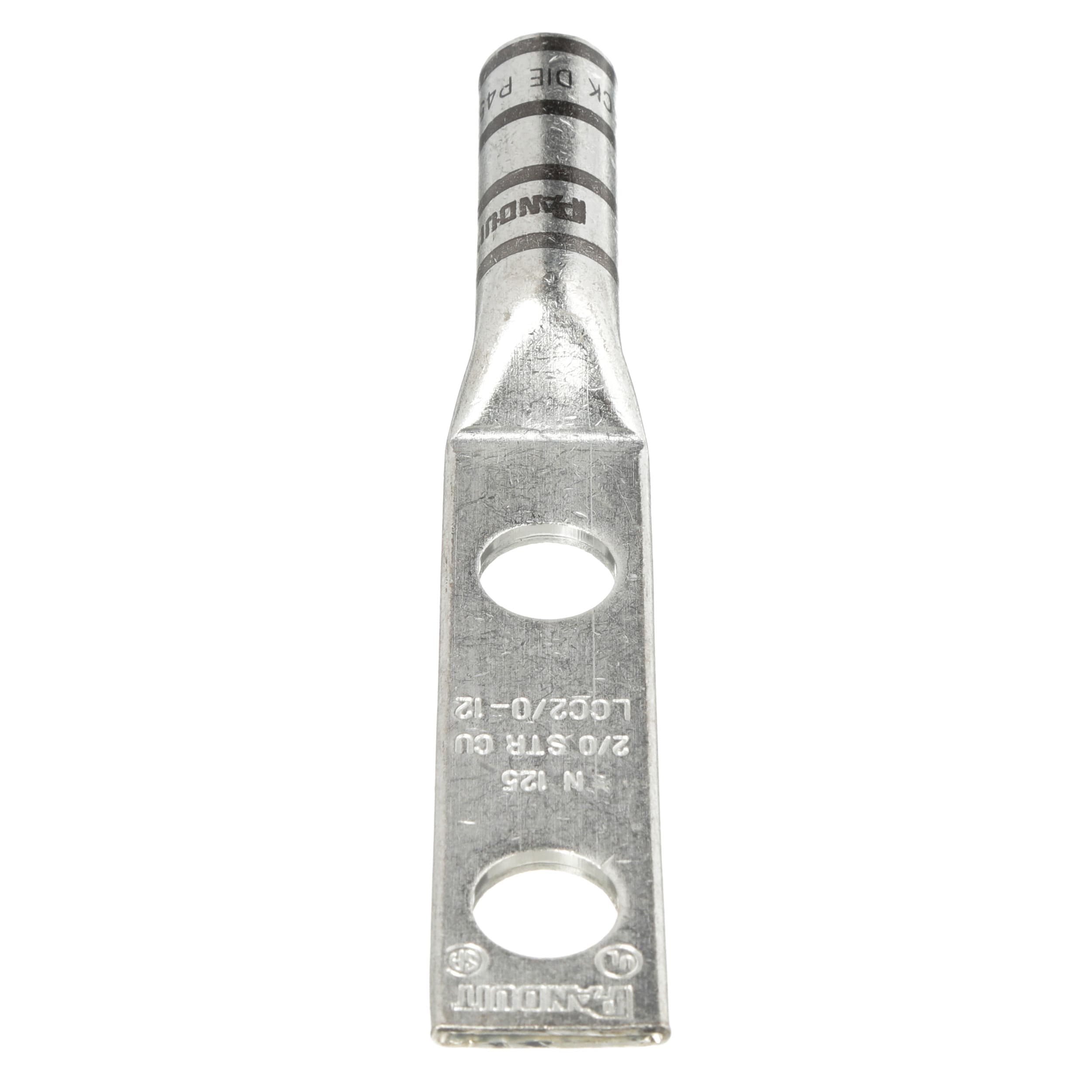 Two-hole, long barrel lug, 2/0 AWG wire, 1/2 stud hole, 1.75 hole spacing.