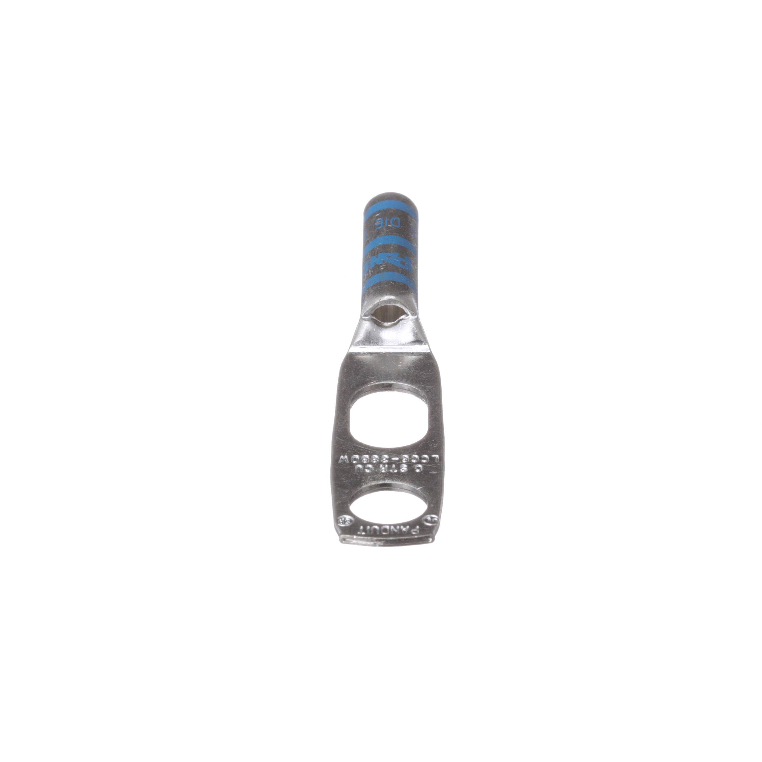 The LCC6-38BDW-L Tin-Plated Copper Compression Lug, two-hole, long barrel, has color-coded barrels marked with Panduit and specified competitor die index numbers for proper crimp die selection. The long barrel maximizes the number of crimps and provides premium wire pull-out strength and performance. The generously beveled wire entry prevents bent back strands when inserting the conductor into the barrel. UL Listed and CSA Certified.