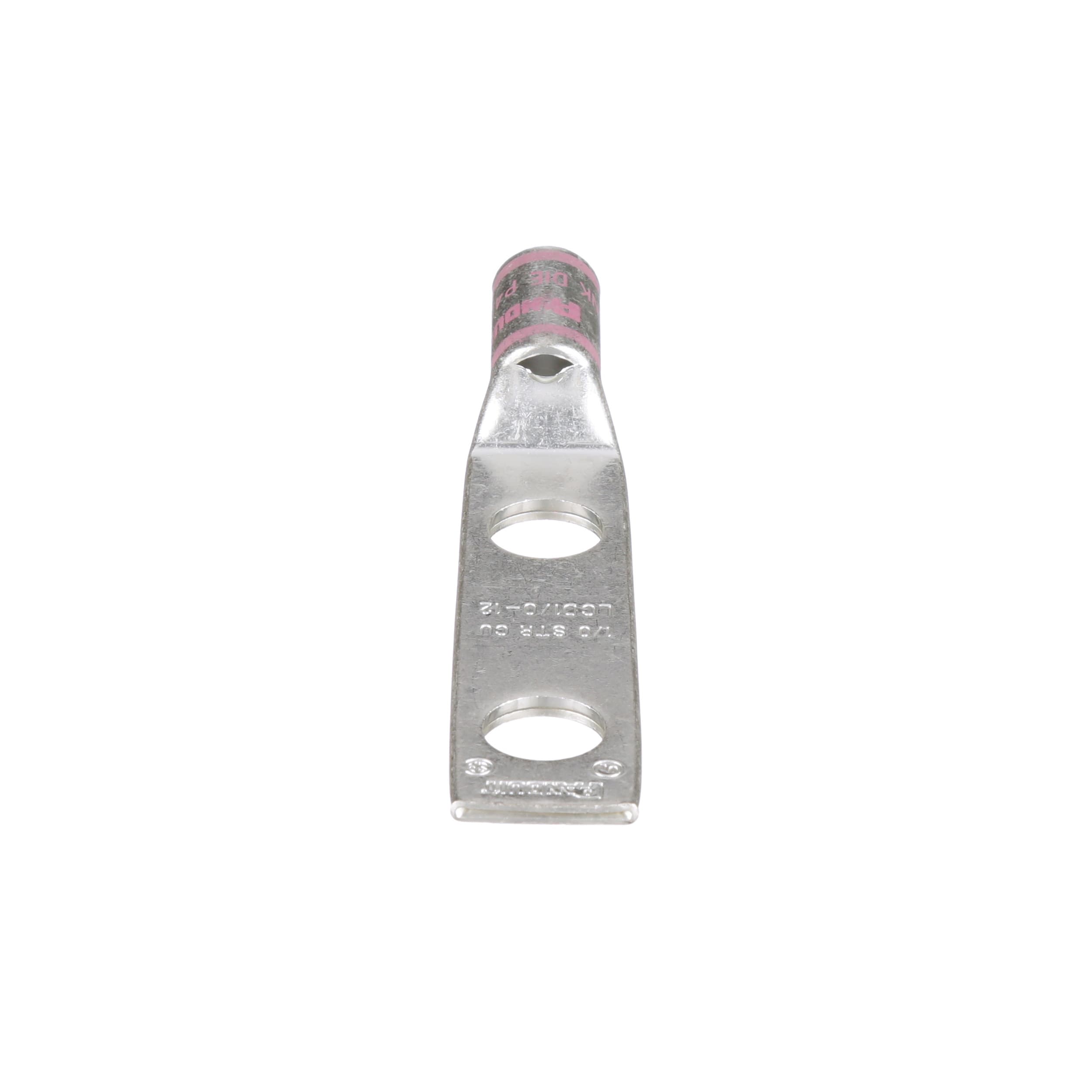 Two-hole, standard barrel lug with window, 1/0 AWG wire, 1/2 stud hole, 1.75 hole spacing.