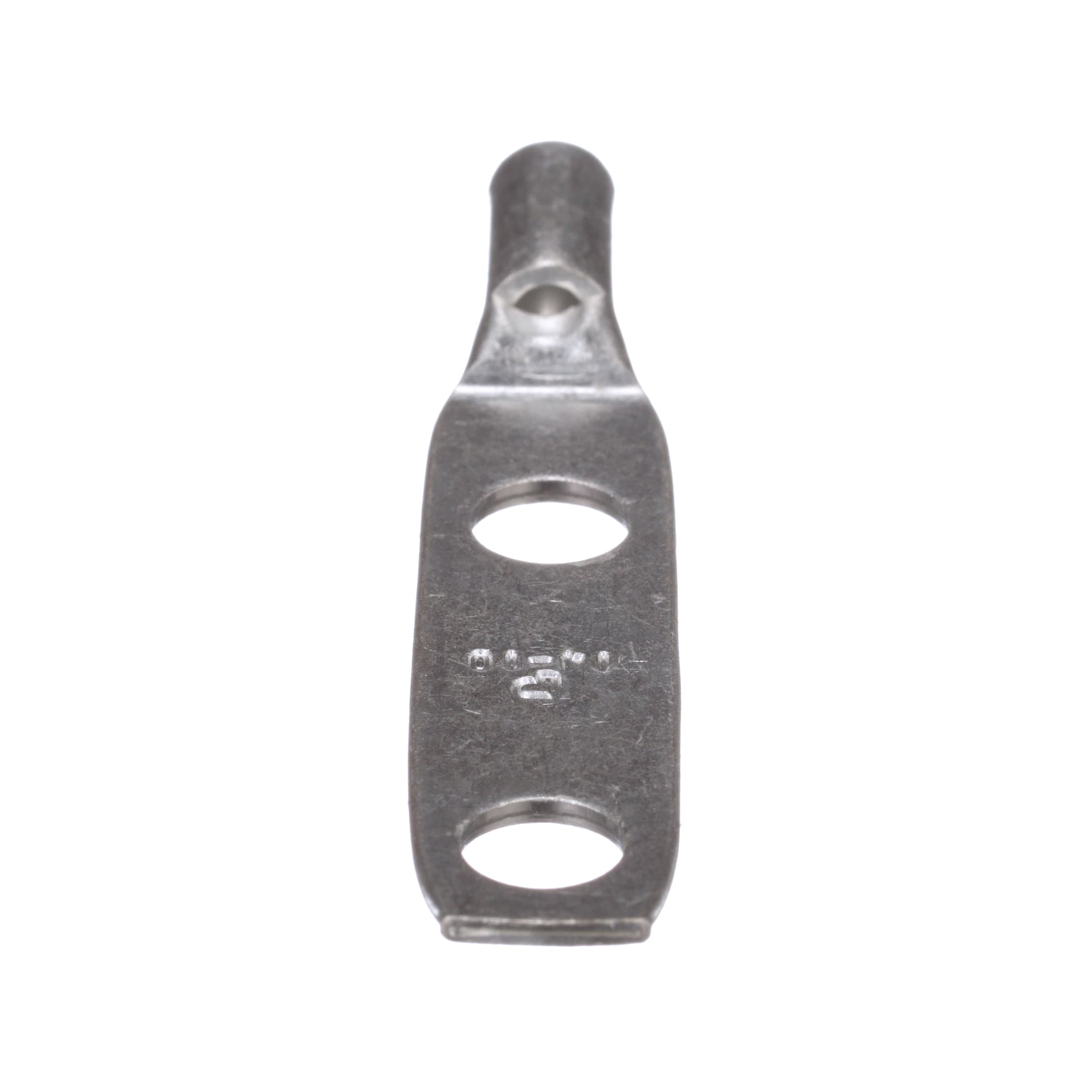 Two-hole, standard barrel lug with window, #10 AWG wire, 1/4 stud hole, 1 hole spacing.