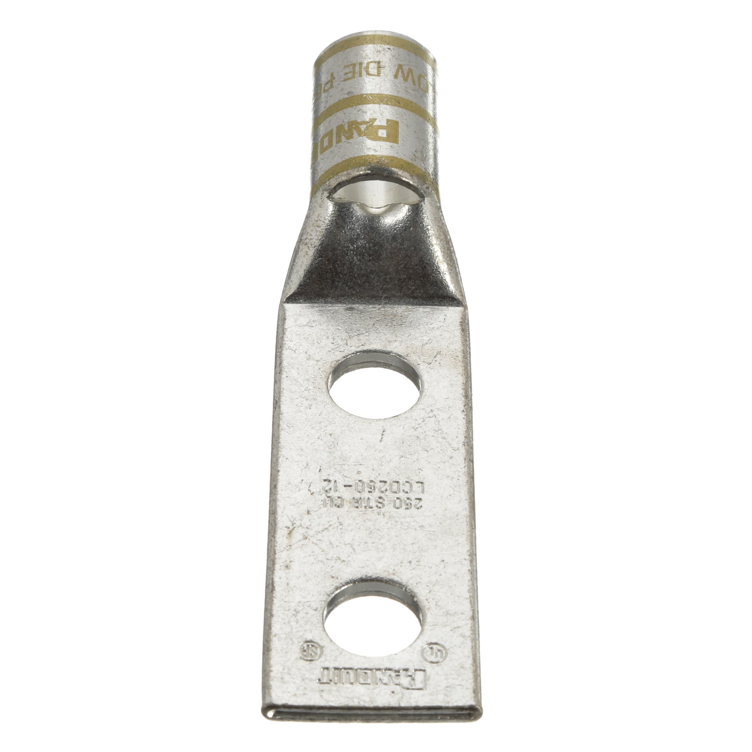 Two-hole, standard barrel lug with window, 250 kcmil cable, 1/2 stud hole, 1.75 hole spacing, NEMA hole sizes and spacing.