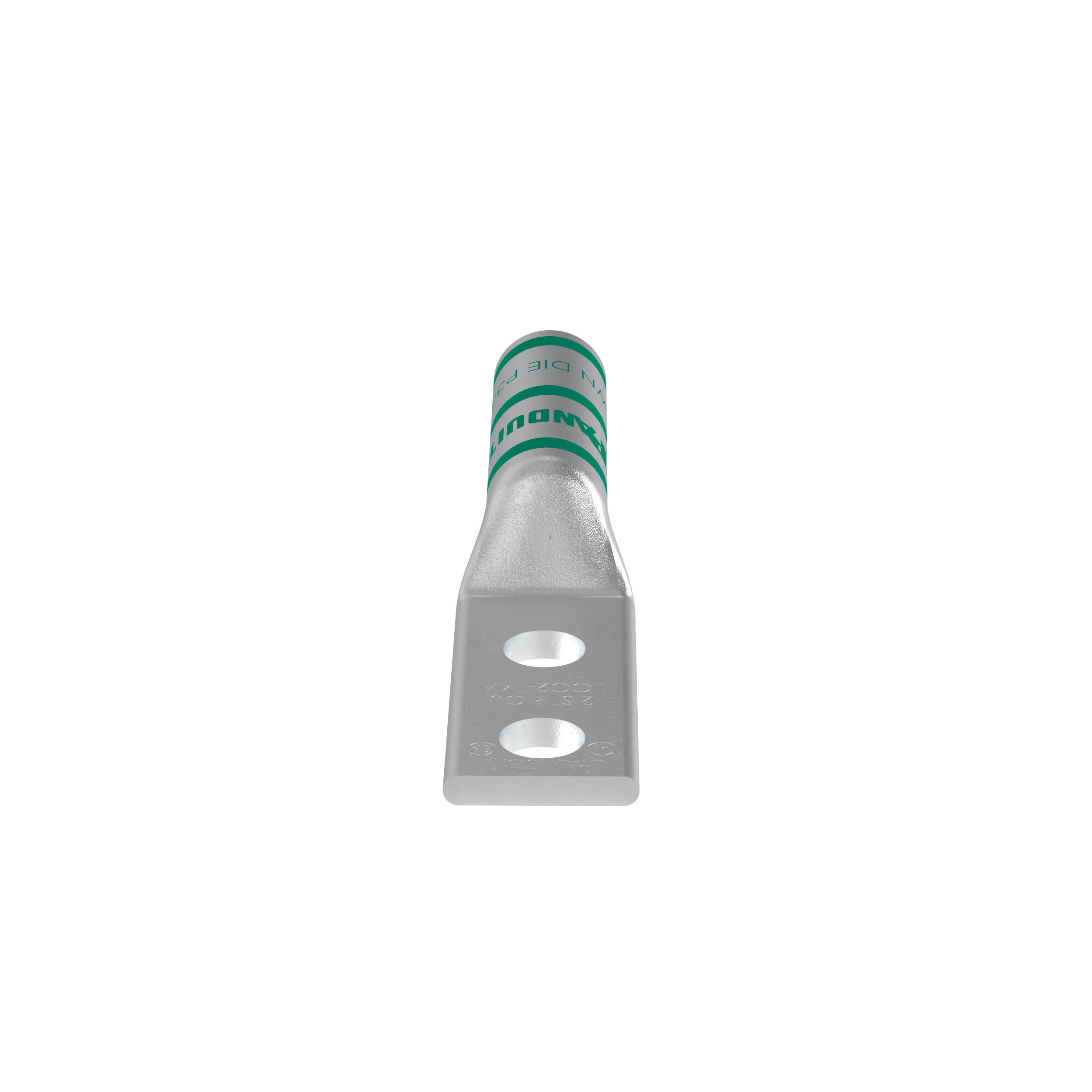 The LCC2-14A-Q Tin-Plated Copper Compression Lug, two-hole, long barrel, has color-coded barrels marked with Panduit and specified competitor die index numbers for proper crimp die selection. The long barrel maximizes the number of crimps and provides premium wire pull-out strength and performance. The generously beveled wire entry prevents bent back strands when inserting the conductor into the barrel. UL Listed and CSA Certified.