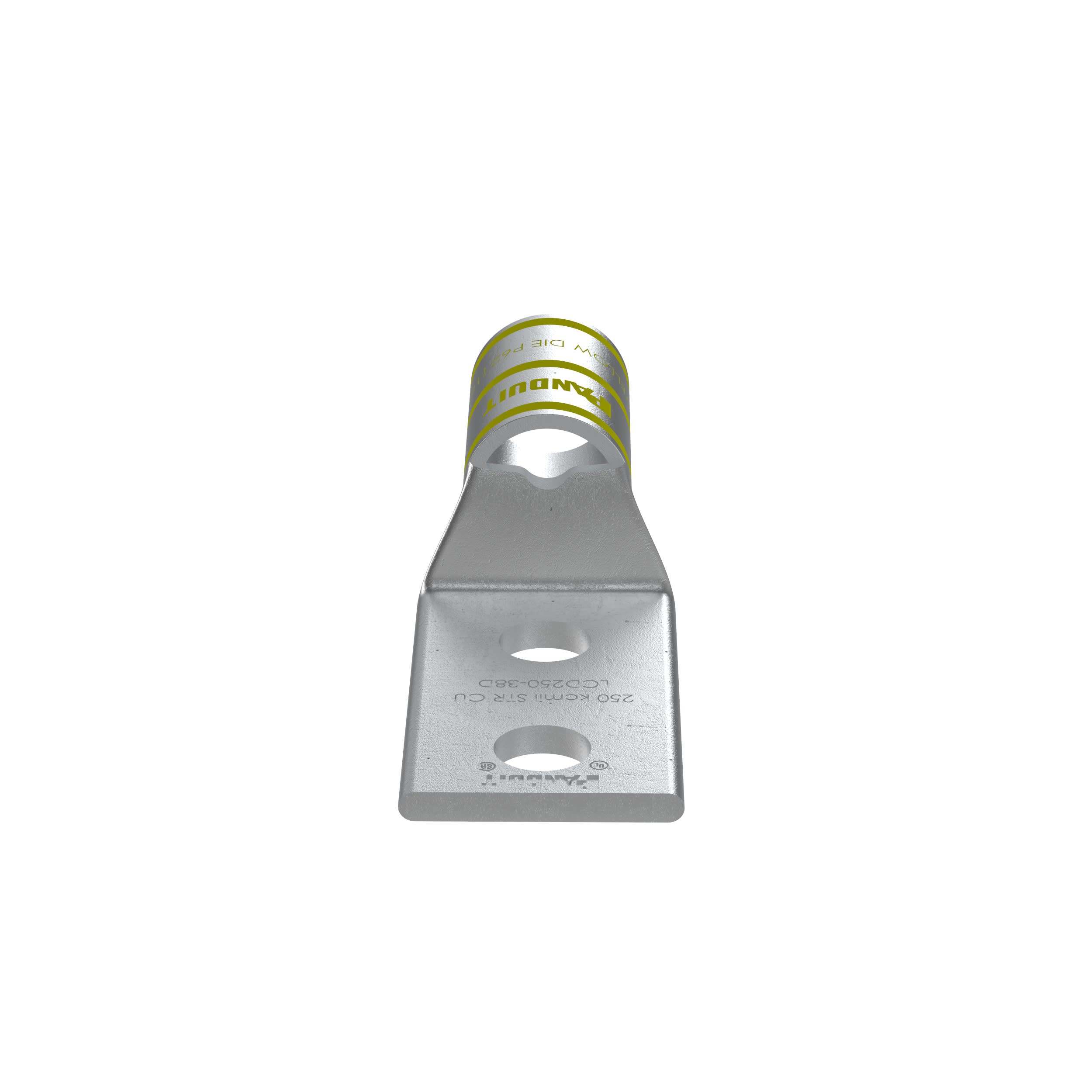 The LCD250-38D-X Tin-Plated Copper Compression Lug, two-hole, standard barrel, has color-coded barrels marked with Panduit and specified competitor die index numbers for proper crimp die selection. An inspection window aids to visually assure full conductor insertion, and the tin-plate material helps to inhibit corrosion. UL Listed and CSA Certified to 35 KV and temperature rated to 90°C.