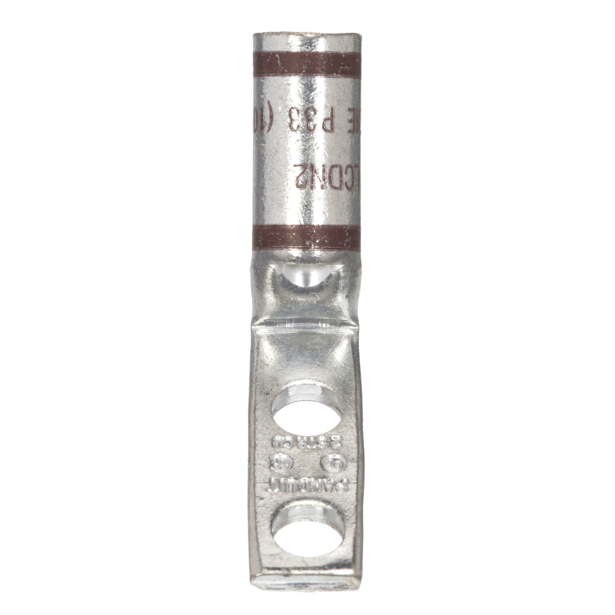 Copper Compression Lug, 2 Hole, No. 2 American Wire Gauge (AWG), Narrow Tongue, 1/4 Inch (6.4 mm) Stud, 90 Degree Bent, 0.63 Inch (16 mm) Hole Spacing, Narrow tongue width for limited space applications, Color-coded barrels marked with Panduit and specified competitor die index numbers for proper crimp die selection, Inspection window to visually assure full conductor insertion, Tin-plated to inhibit corrosion, UL Listed and CSA Certified to 35 KV and temperature rated to 90 Degrees C when crimped with Panduit and specified competitor crimping tools and dies, UL Listed and CSA Certified for wide wire range-taking capability when crimped with Panduit Uni-Die Dieless Crimping Tools.