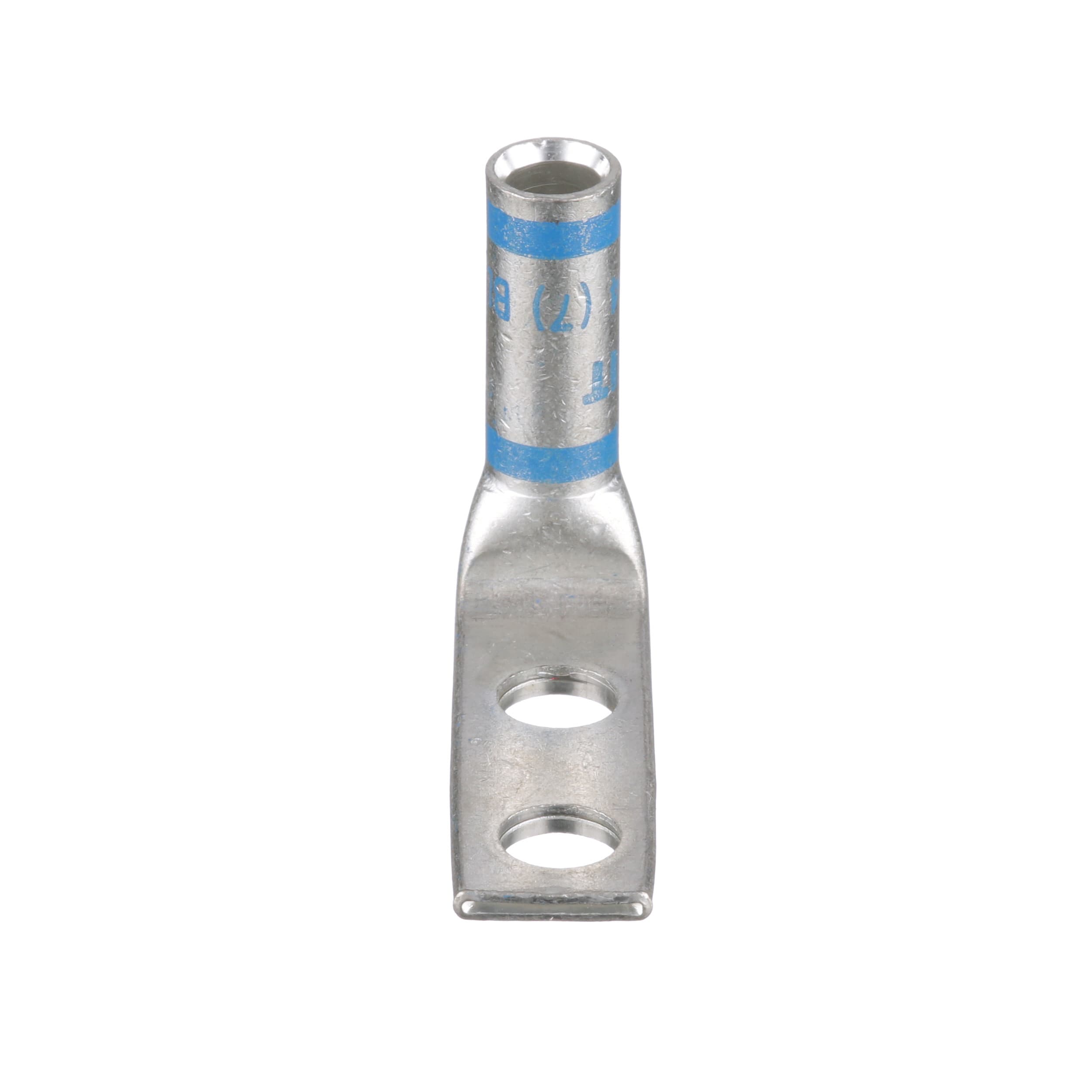 The LCD6-14AF-L Tin-Plated Copper Compression Lug, two-hole, standard barrel, has color-coded barrels marked with Panduit and specified competitor die index numbers for proper crimp die selection. An inspection window aids to visually assure full conductor insertion, and the tin-plate material helps to inhibit corrosion. UL Listed and CSA Certified to 35 KV and temperature rated to 90°C.